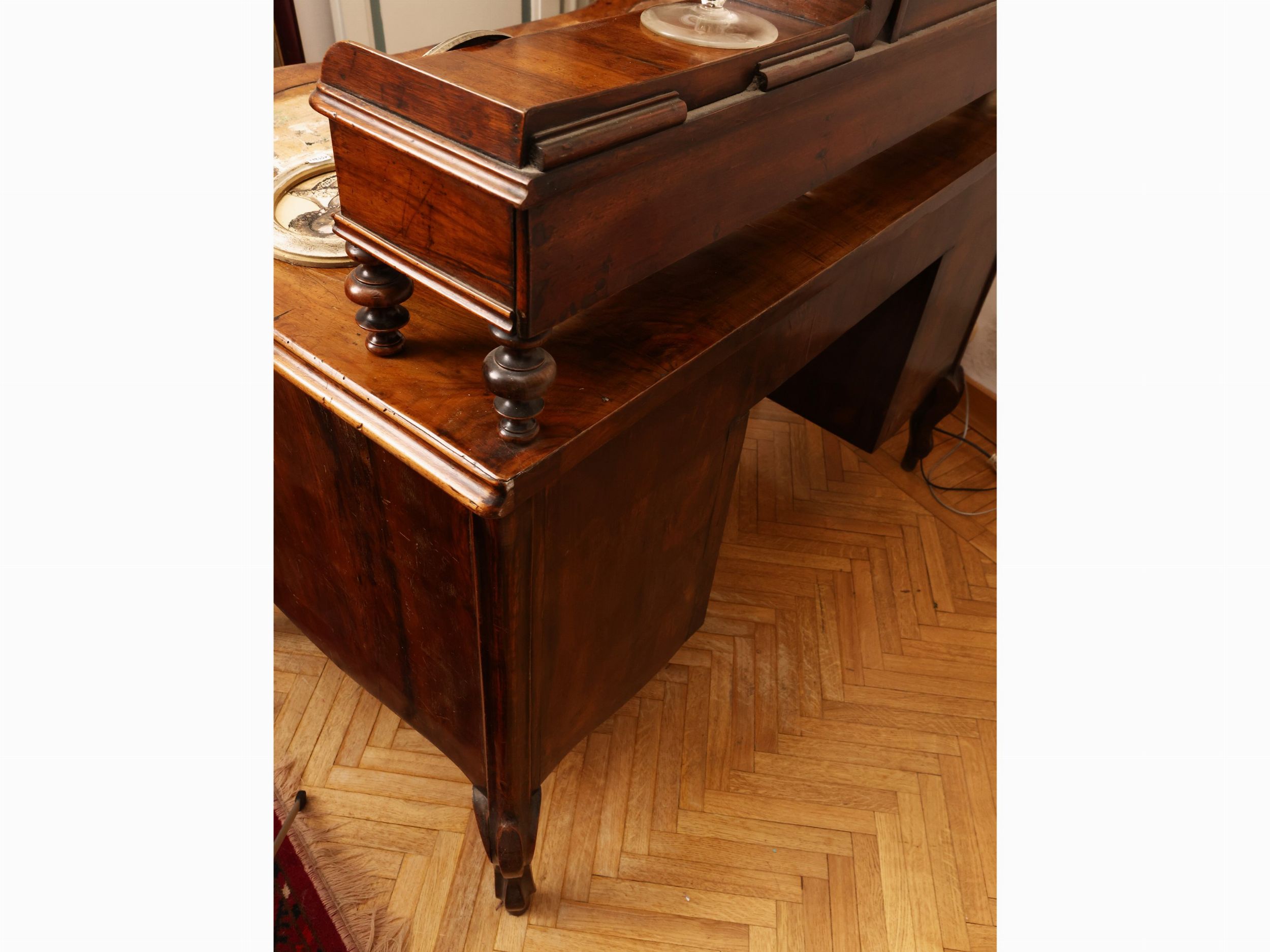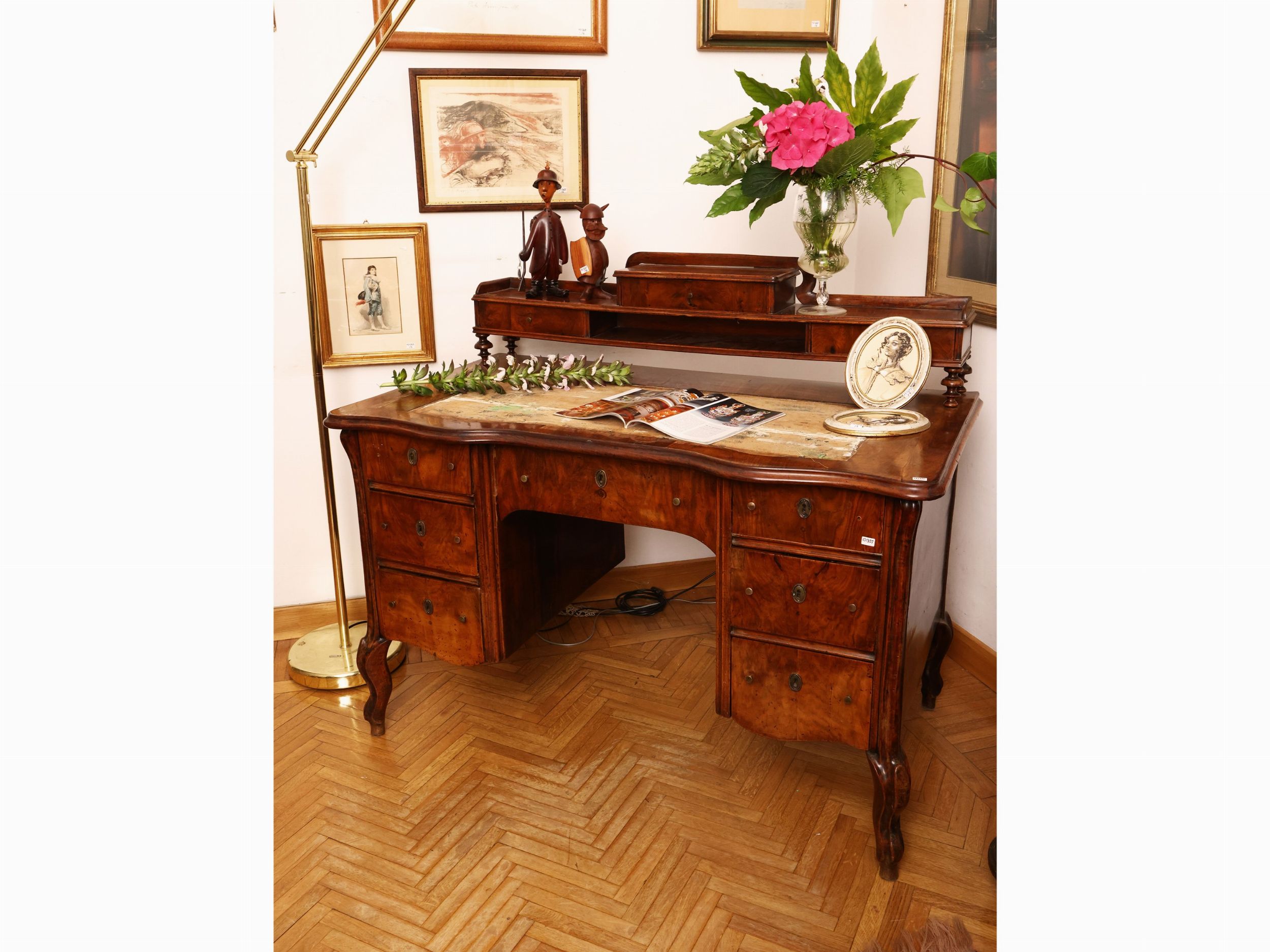 h cm 100x124x68 seconda metà del XIX secolo sul piano sagomato, in parte rivestito in cuoio verde, un'alzata con vani e cassettini, un cassetto centrale nella pendaglina ed altri tre per ciascun lato, gambe mosse con piedini a ricciolo, alcuni difetti