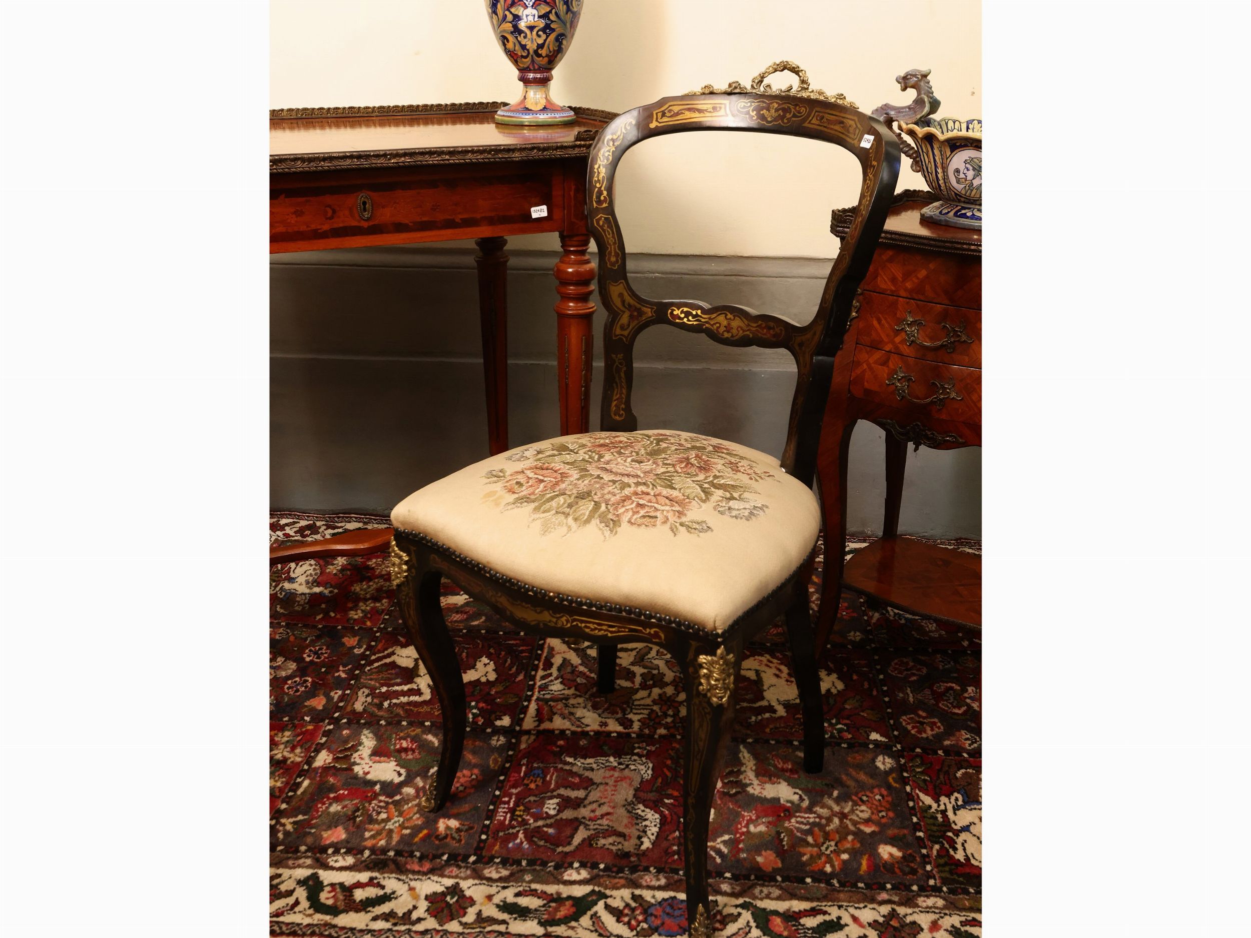 h cm 91 dipinte con motivo vegetale entro riserve nei toni dell'oro, schienale arrotondato, cartella sagomata, seduta imbottita e rivestita in tessuto color beige ricamato con motivo floreale, applicazioni in ottone raffiguranti mascheroni e motivi floreali, lievi difetti