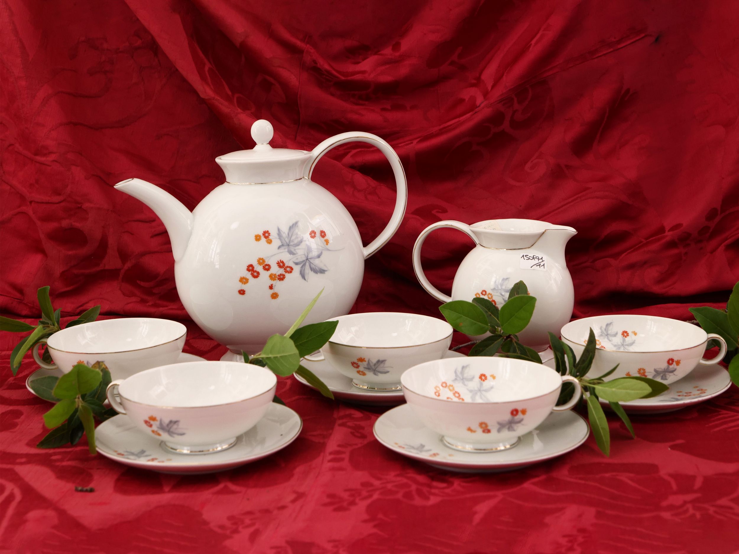 h da cm 4,5 a cm 20,5 (11) Anni Trenta decorato con motivo floreale nei toni dell'arancio e del grigio, profilato in argento, composto da teiera, lattiera, zuccheriera e serie di otto tazze con piattino, lievi difetti