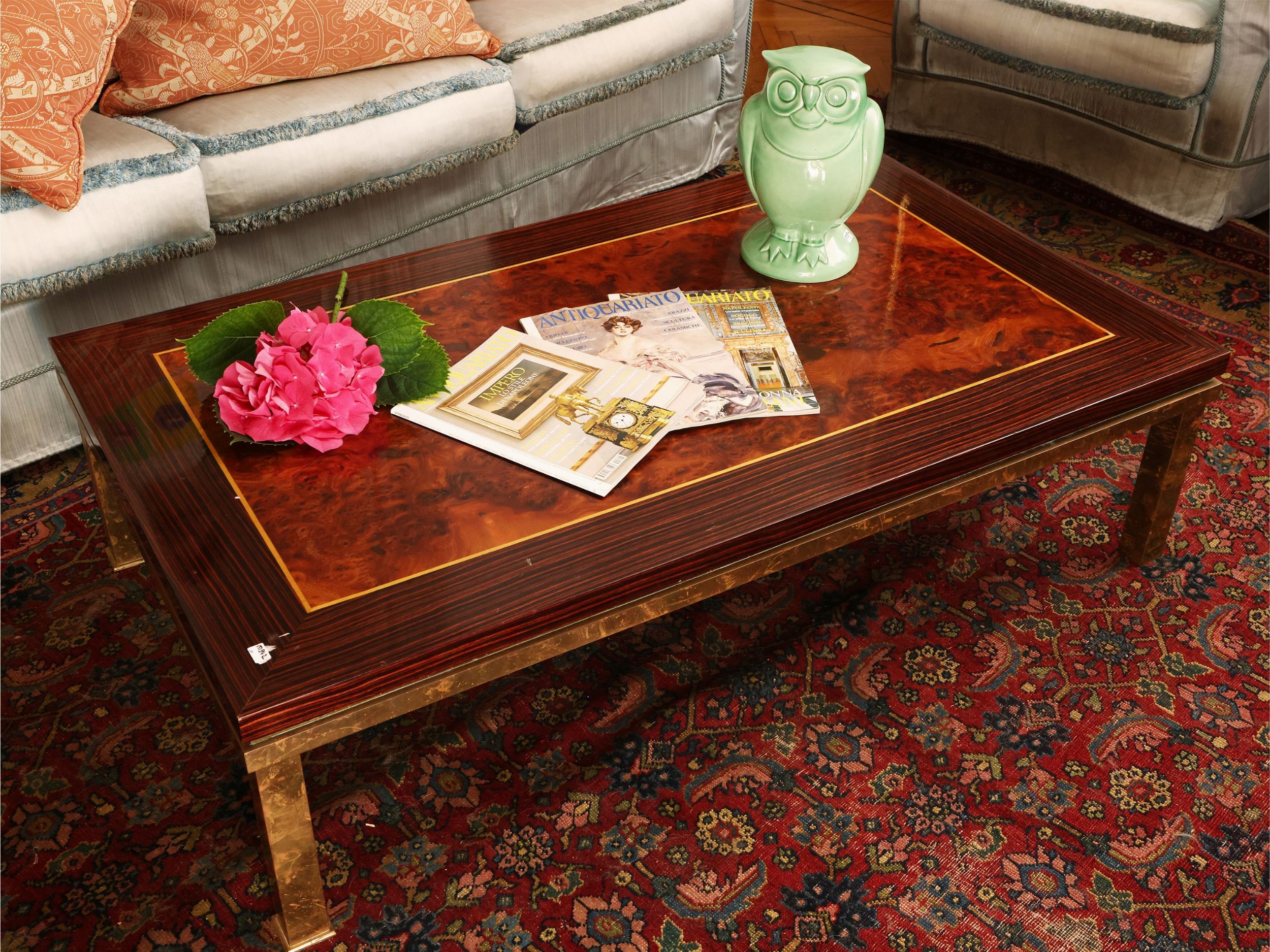 Anni Ottanta piano intarsiato in satinwood e radica, base in ottone