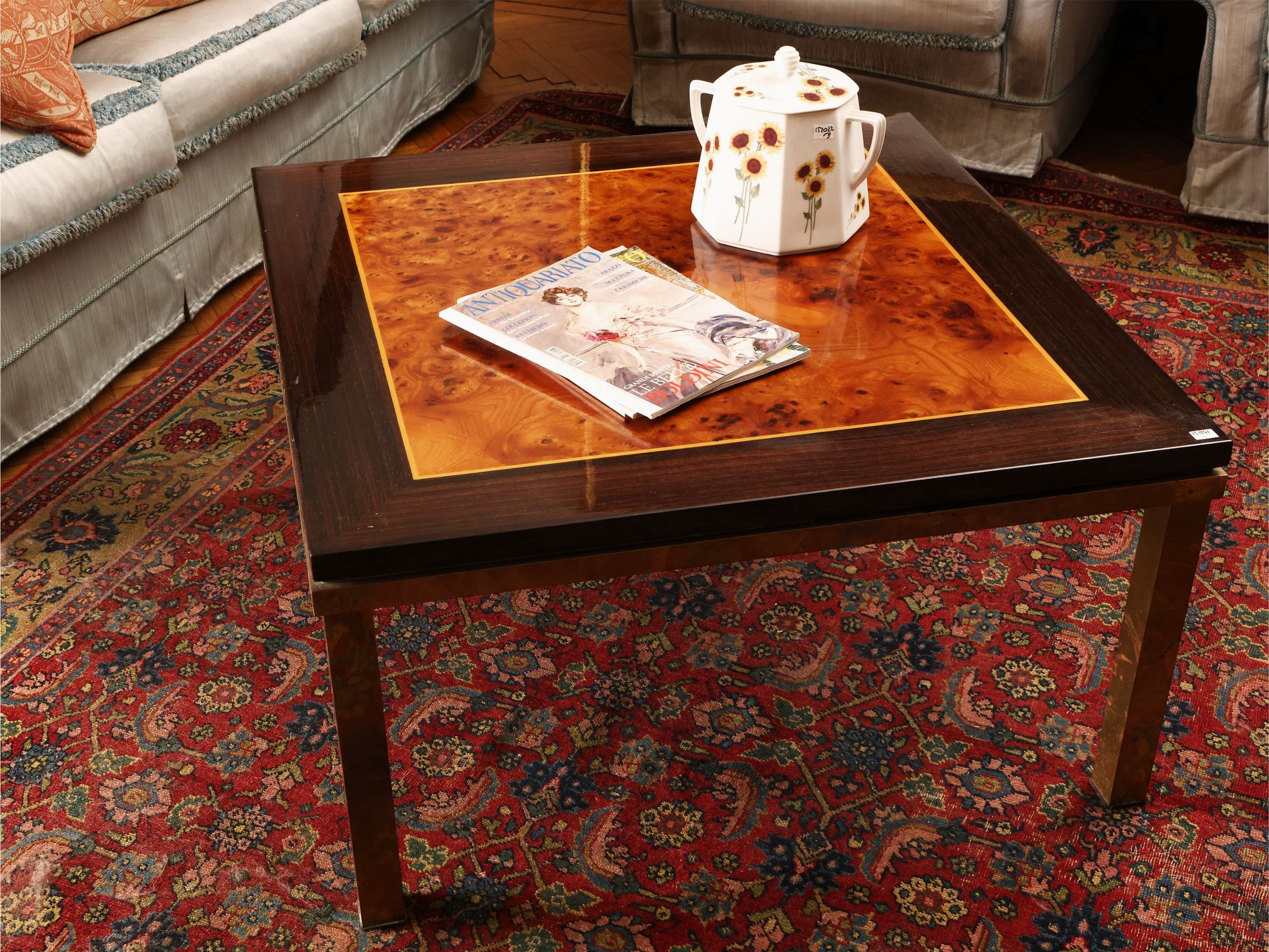 Anni Ottanta piano intarsiato in satinwood e radica, base in ottone