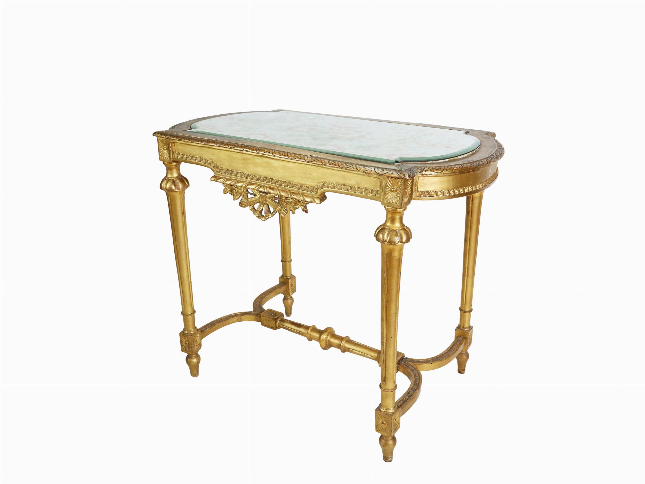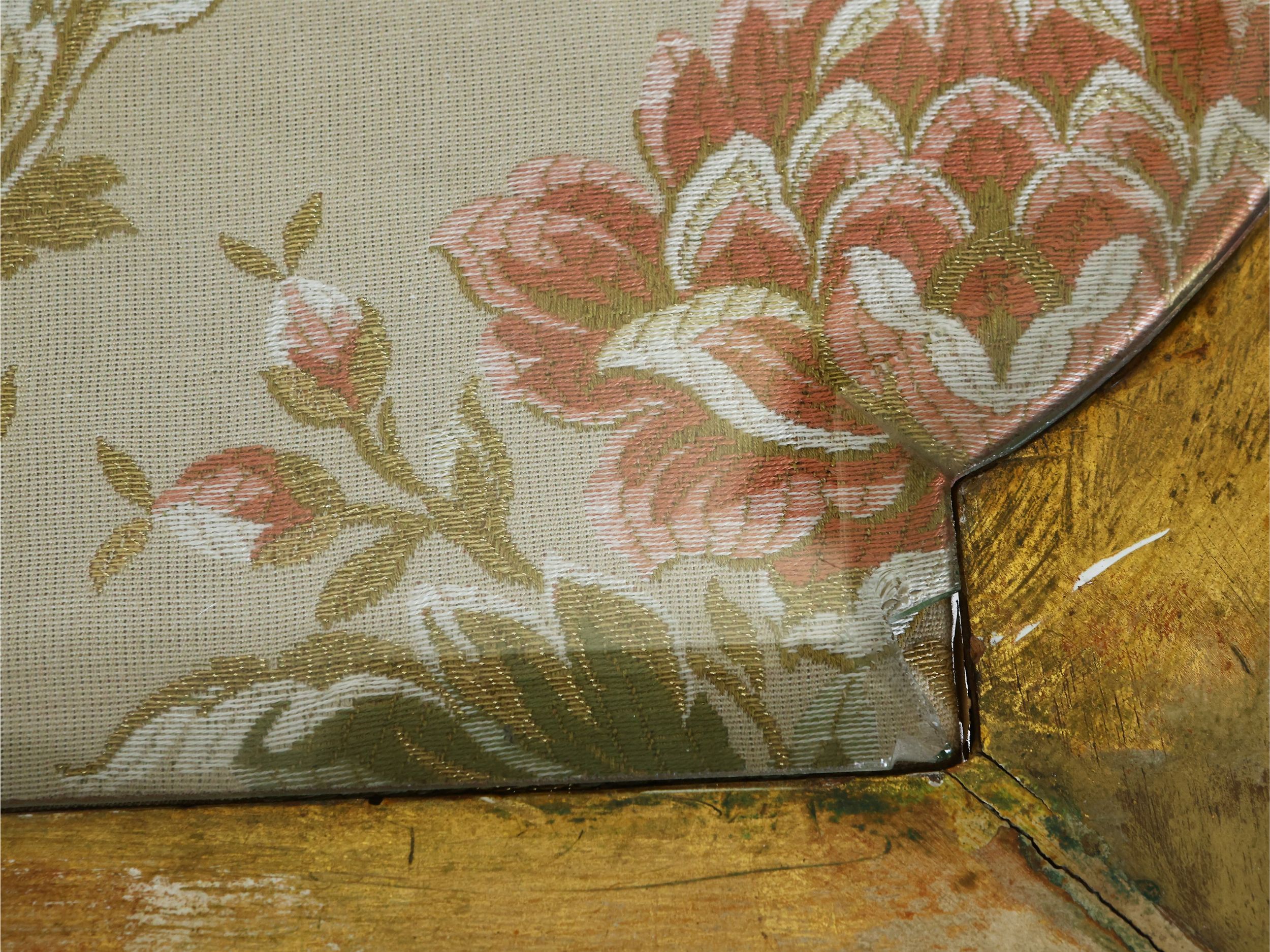 Francia, fine del XIX secolo piano rivestito in broccato e vetro molato (difetto), pendaglina intagliata con motivi floreali, gambe riunite da traversa, alcuni difetti