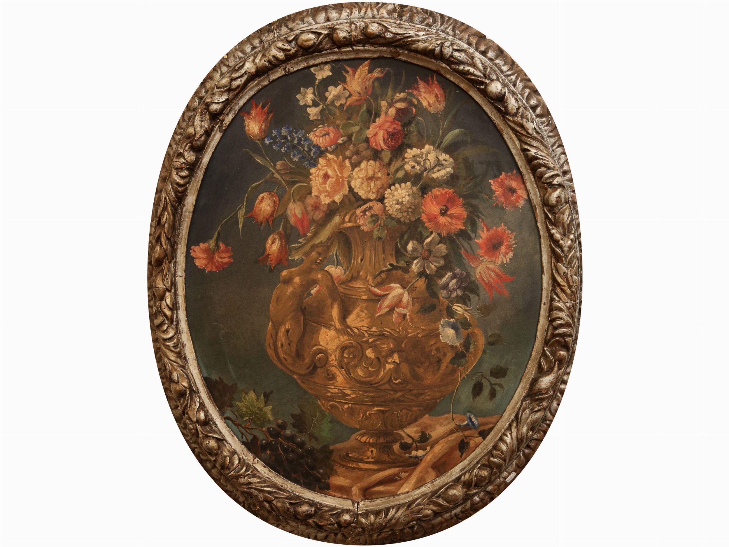 Napoli, XVIII secolo olio su tela in ovale, in cornice coeva in legno dorato a mecca ed intagliato con ghirlanda di foglie d'acanto e frutti , lievi difetti