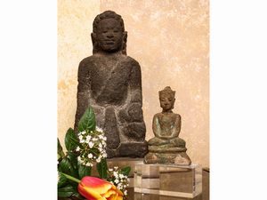 h cm 30 e cm 14 (2) Arte balinese raffigurante una divinità, abbinata ad un'altra di dimensioni minori con difetti, [..]