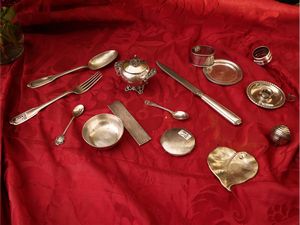 gr 360 (15) tra cui un set di posate completo per una persona, una piccola zuccheriera sbalzata con volute vegetali [..]