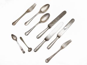 gr 2690 (40) Stato Pontificio, XIX secolo composto da 10 forchette, 11 cucchiai, 8 coltelli, abbinate a 6 forchette [..]