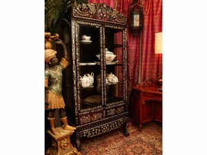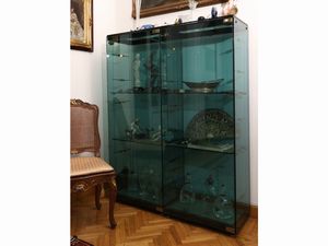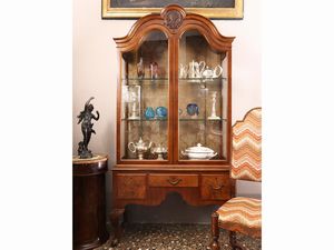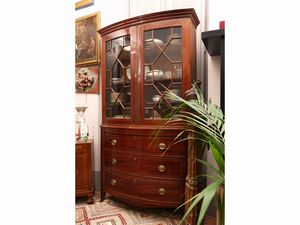 h cm 116x104x32 INghilterra, prima metà del XX secolo fronte a vetro a doppia mossa, due sportelli bombati laterali, [..]