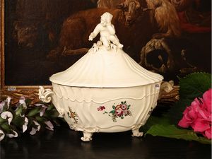 h cm 27x35x20 1780 circa coperchio sormontato da puttino, anse a voluta, bordo ad imitazione intreccio di paglia, [..]