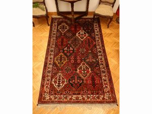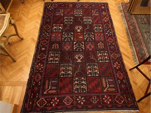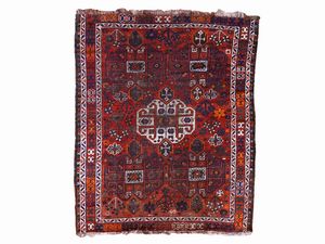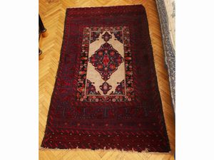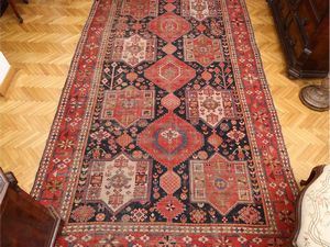 cm 356x200 campo a motivi geometrici nei toni del rosso, blu, bianco e azzurro, ampi segni di consunzione
