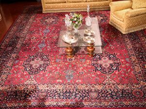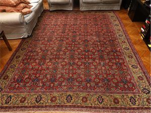 cm 310x230 campo rosso cn motivi floreali geometrici multicolori, segni di consunzione