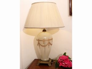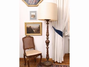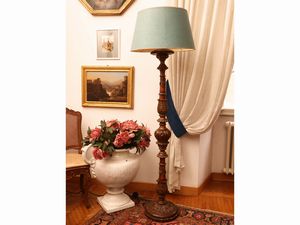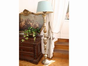 h cm 190 intagliata con motivi di foglie d'acanto e ghirlande, corredata di paralume, alcuni difetti