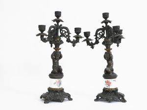 h cm 41,5 inizio del XX secolo sorretti da amorino, tre bracci portacandele e uno centrale, lievi difetti