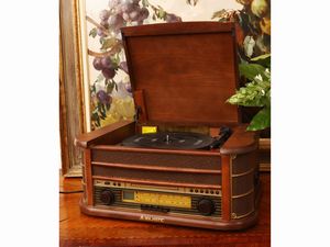 h cm 21x39x43 di gusto vintage, in legno, con giradischi, radio e lettore cd, possibili difetti