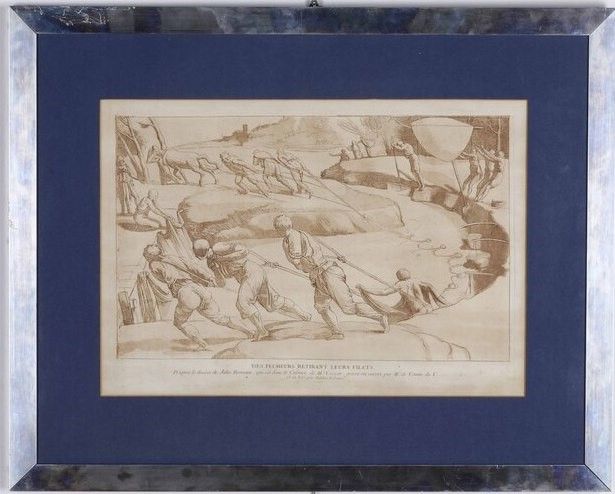 Antica incisione da un dipinto di Giulio Romano DES PECHEURS RETIRANT LEURS FILETS. [..]