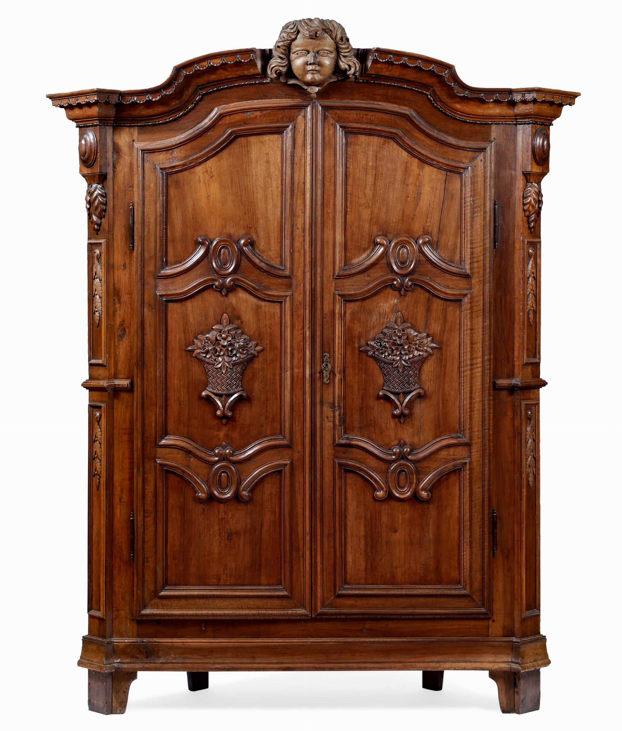 Armadio ad angolo in noce a due ante pannellate. XVIII secolo