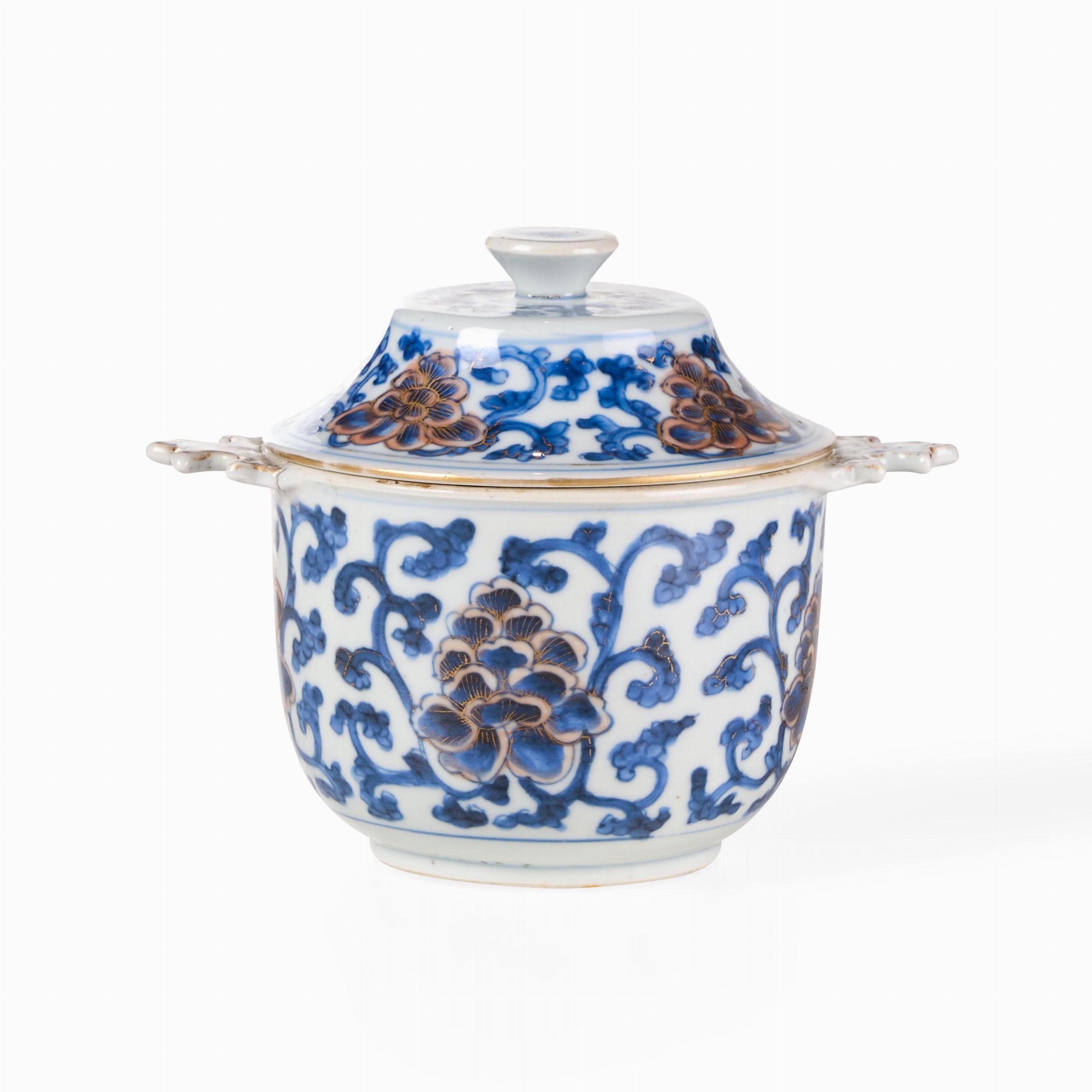 Ciotola con coperchio in porcellana bianca e blu con decori floreali lumeggiati [..]