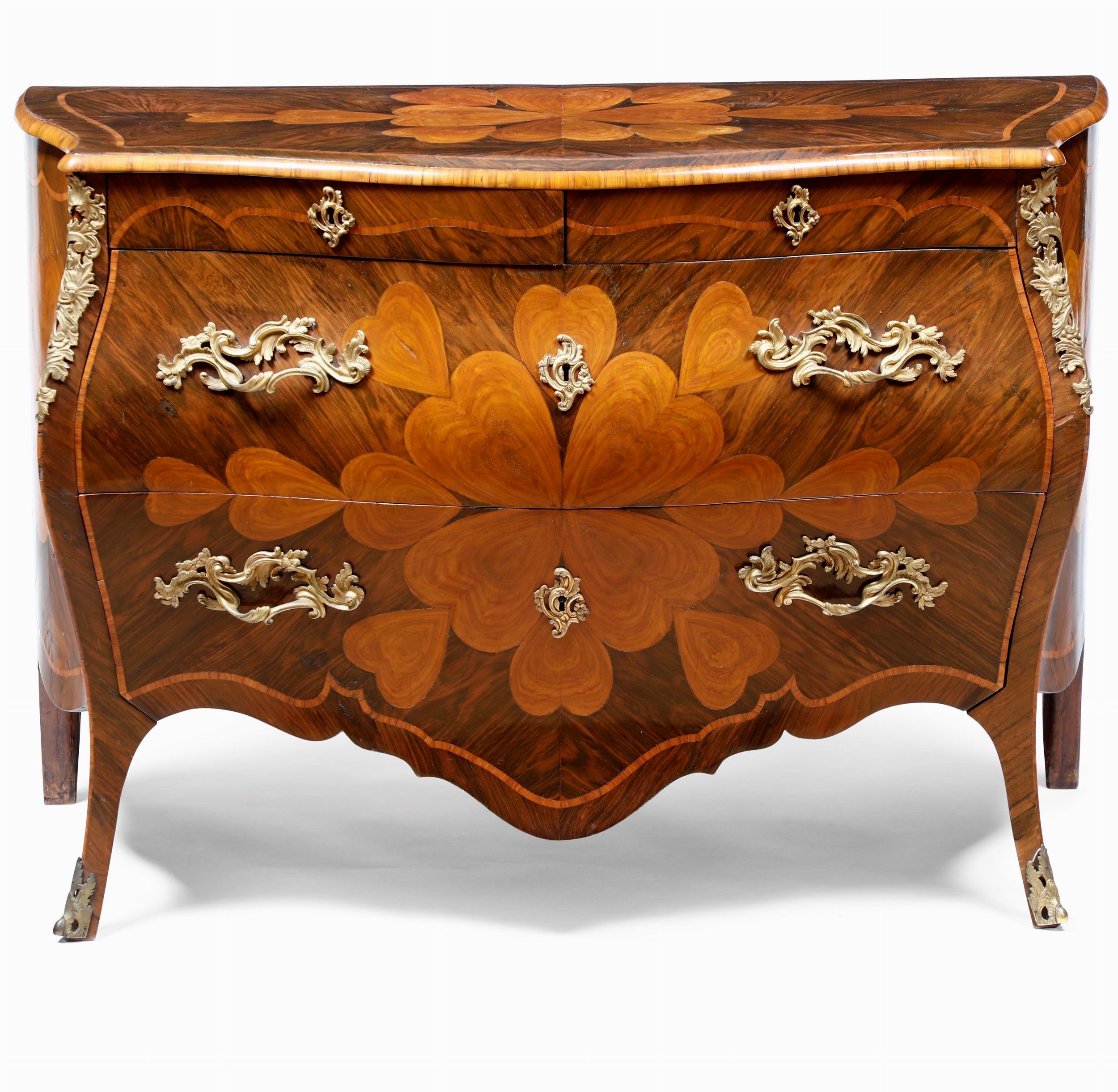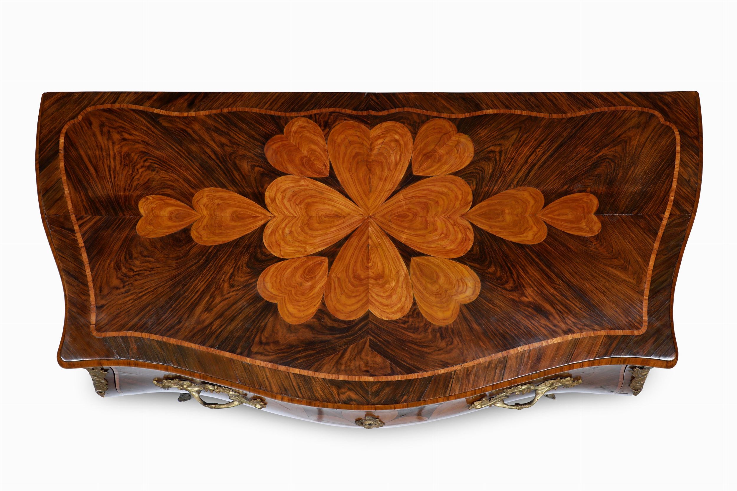 Largh. 132 - Prof. 61 - Alt. 90 Cm Quadrifogli intarsiati sul fronte, sui fianchi e sul piano, fronte bombato con due cassetti grandi e due piccoli affiancati, fianco concavo, ciabatte, cascate, bocchette e maniglie in bronzo fuso, cesellato e dorato