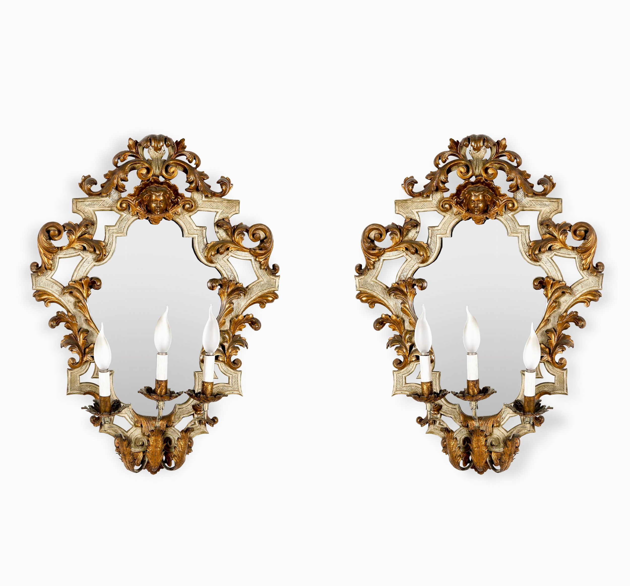 Coppia di appliques in legno intagliato, traforato, laccato e dorato. XVIII seco [..]