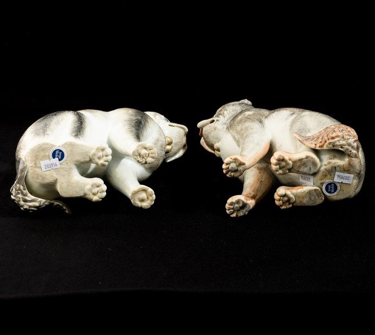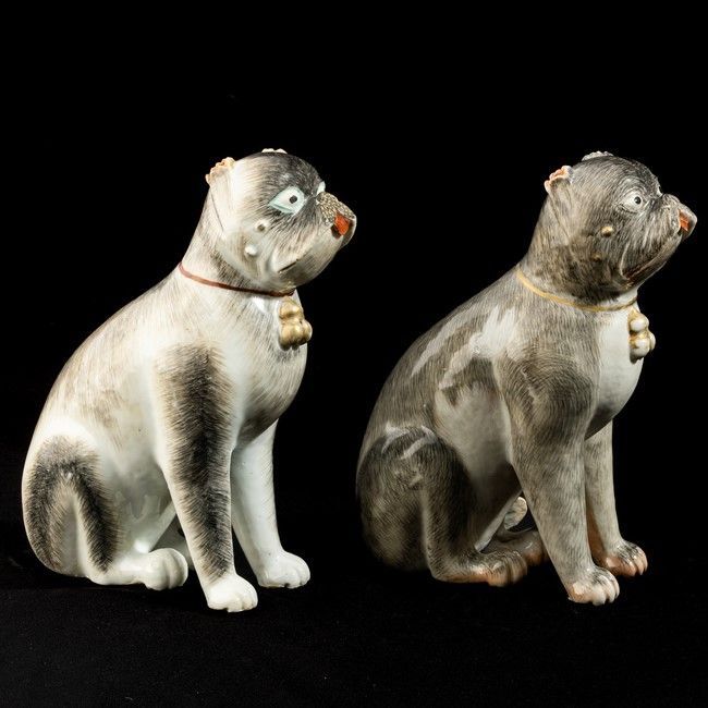 Coppia di cani carlini in porcellana decorati in smalti policromi e oro, Cina, Dinastia [..]