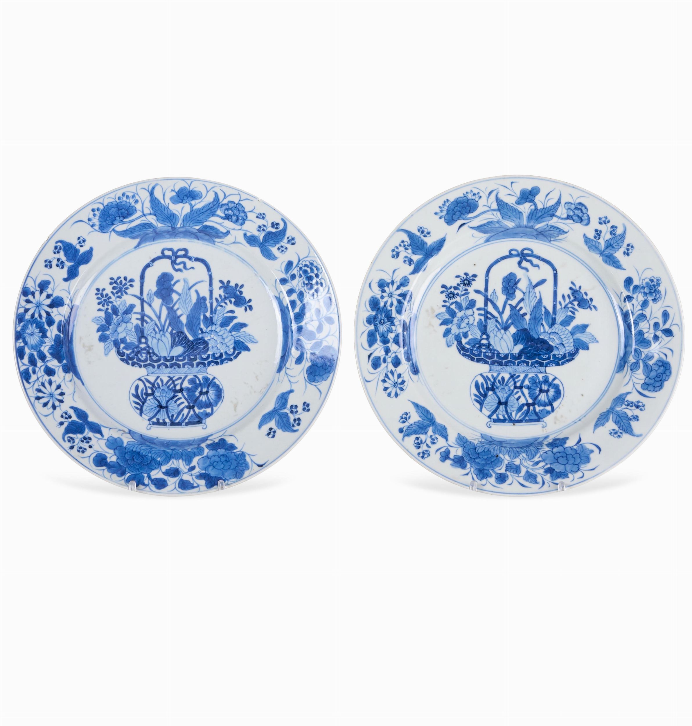Coppia di piatti in porcellana bianca e blu con soggetti naturalistici e decori [..]