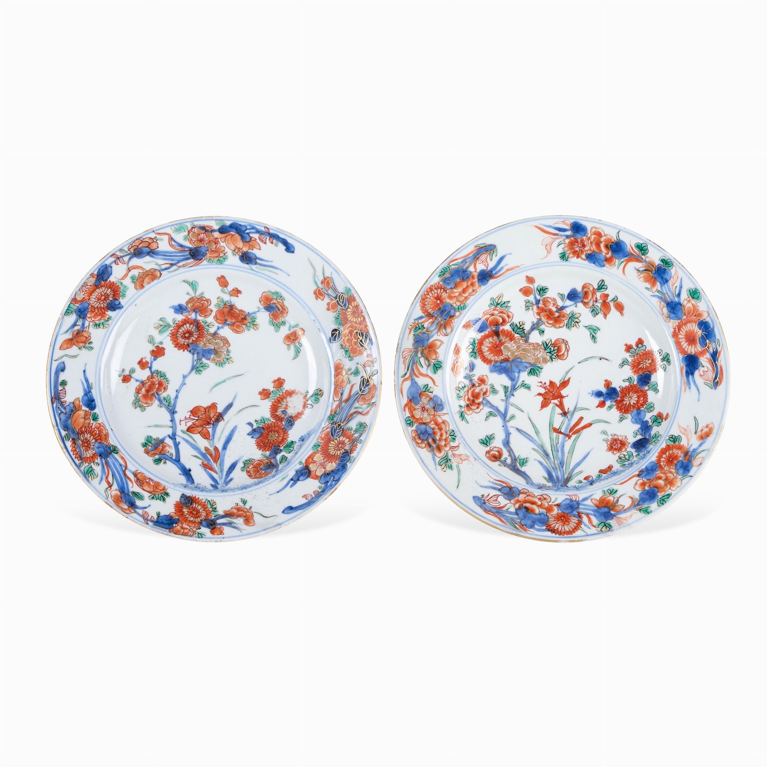 Coppia di piatti in porcellana Imari con decoro floreale e rami in fiore, Cina, [..]