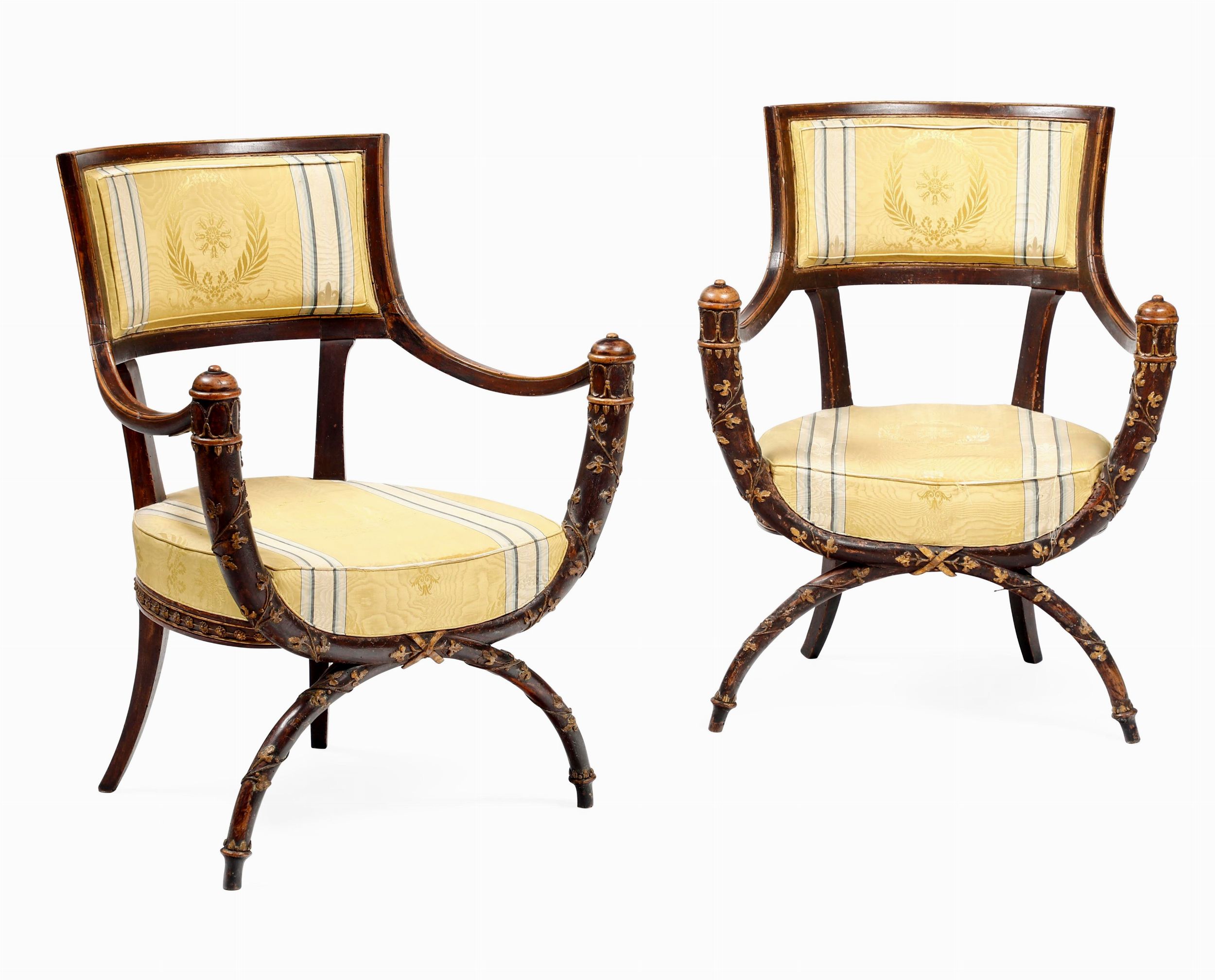 Coppia di poltrone in legno intagliato, laccato con decori dorati. Ebanisteria neoclassica [..]