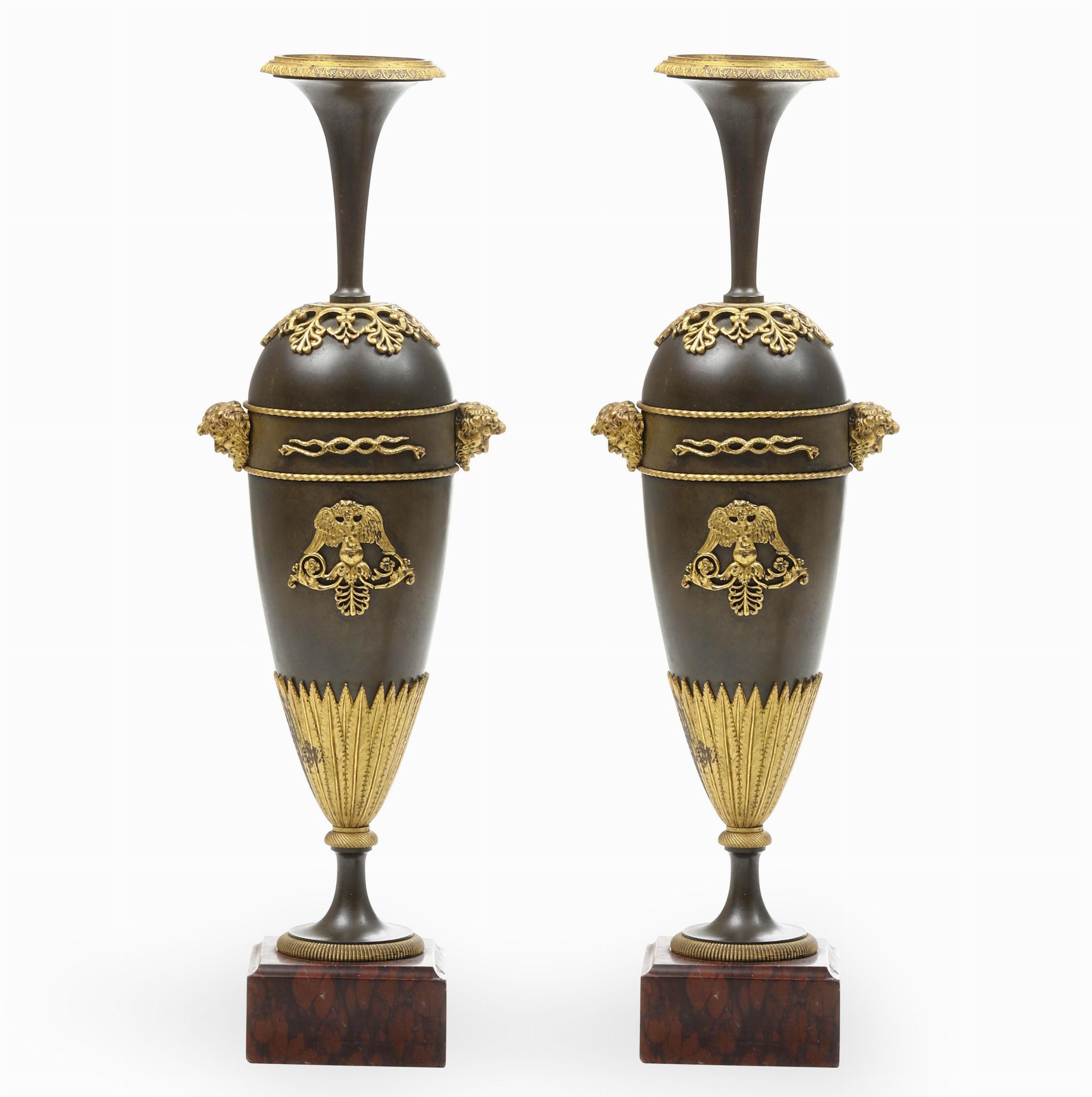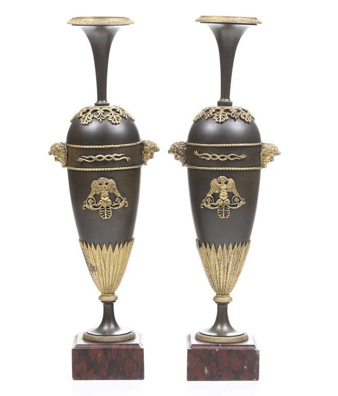 Coppia di vasi ad anfora in bronzo fuso e dorato, XIX secolo