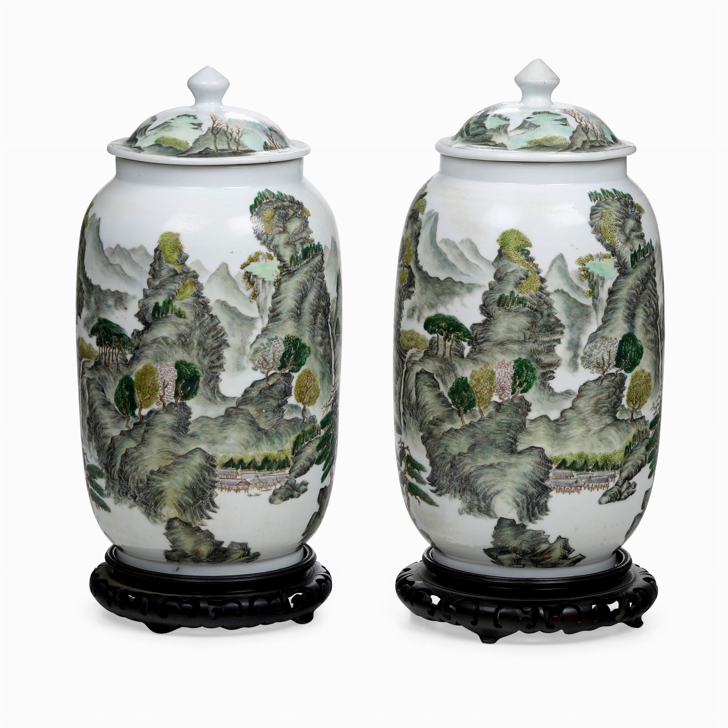 Coppia di vasi con coperchio a paesaggi, Cina, Repubblica, XX secolo