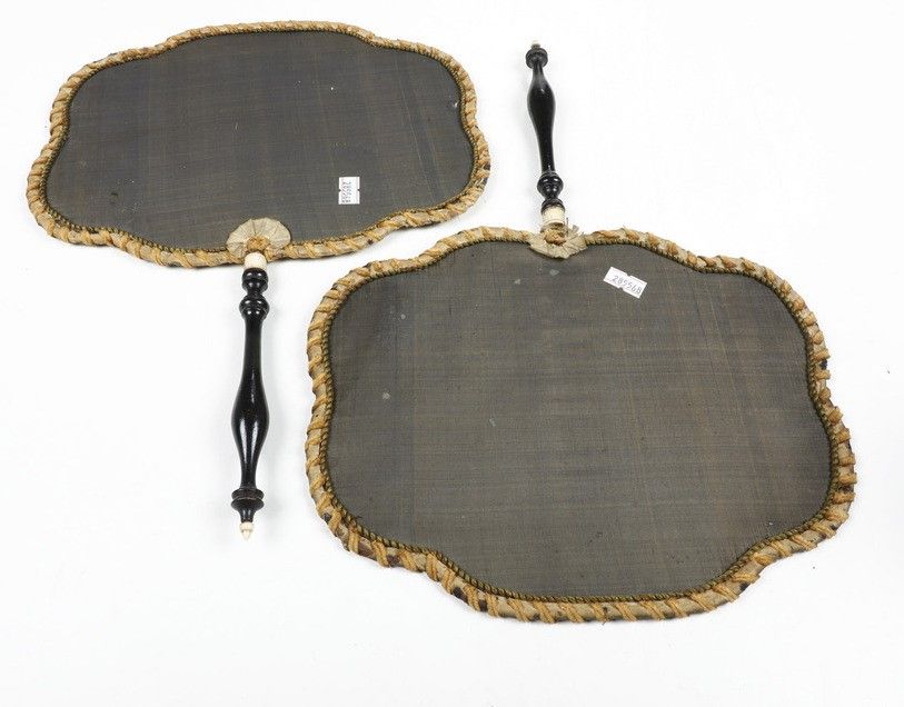 Coppia di ventagli in stoffa ricamata e manico in legno