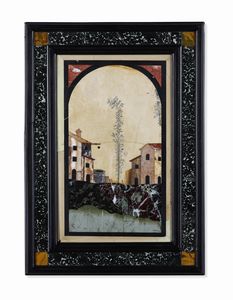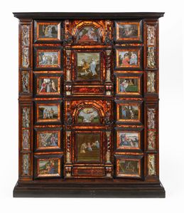 Cm 148X43X178 Lastronati in tartaruga con profili sagomati in mogano, colonne tortili impreziosite con bronzi [..]