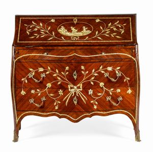 Cm 113X49X111 due grandi cassetti e due più piccoli affiancati sotto la calatoia. Ricchi decori intarsiati [..]