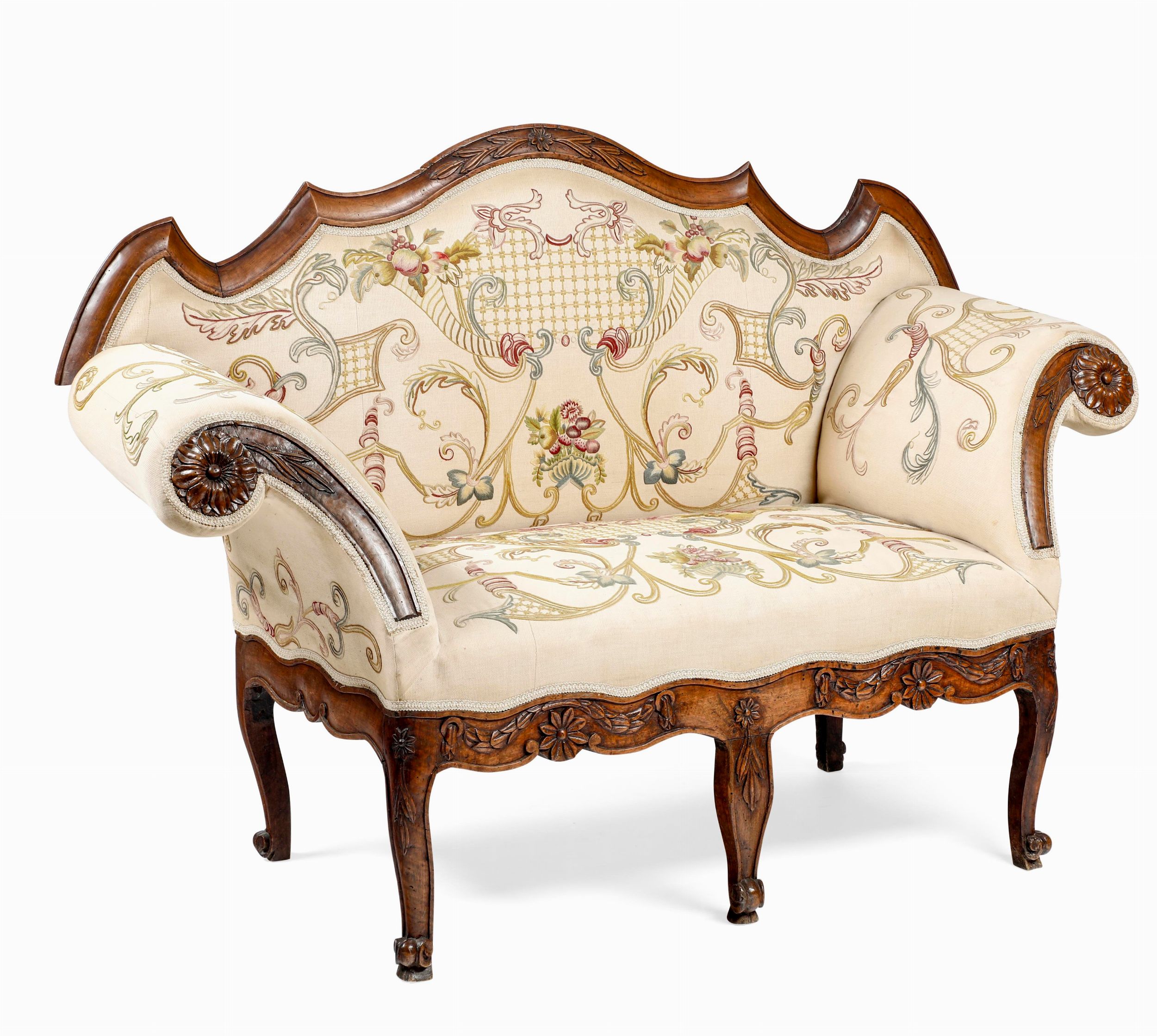 Divano a orecchioni in noce intagliato. XVIII secolo