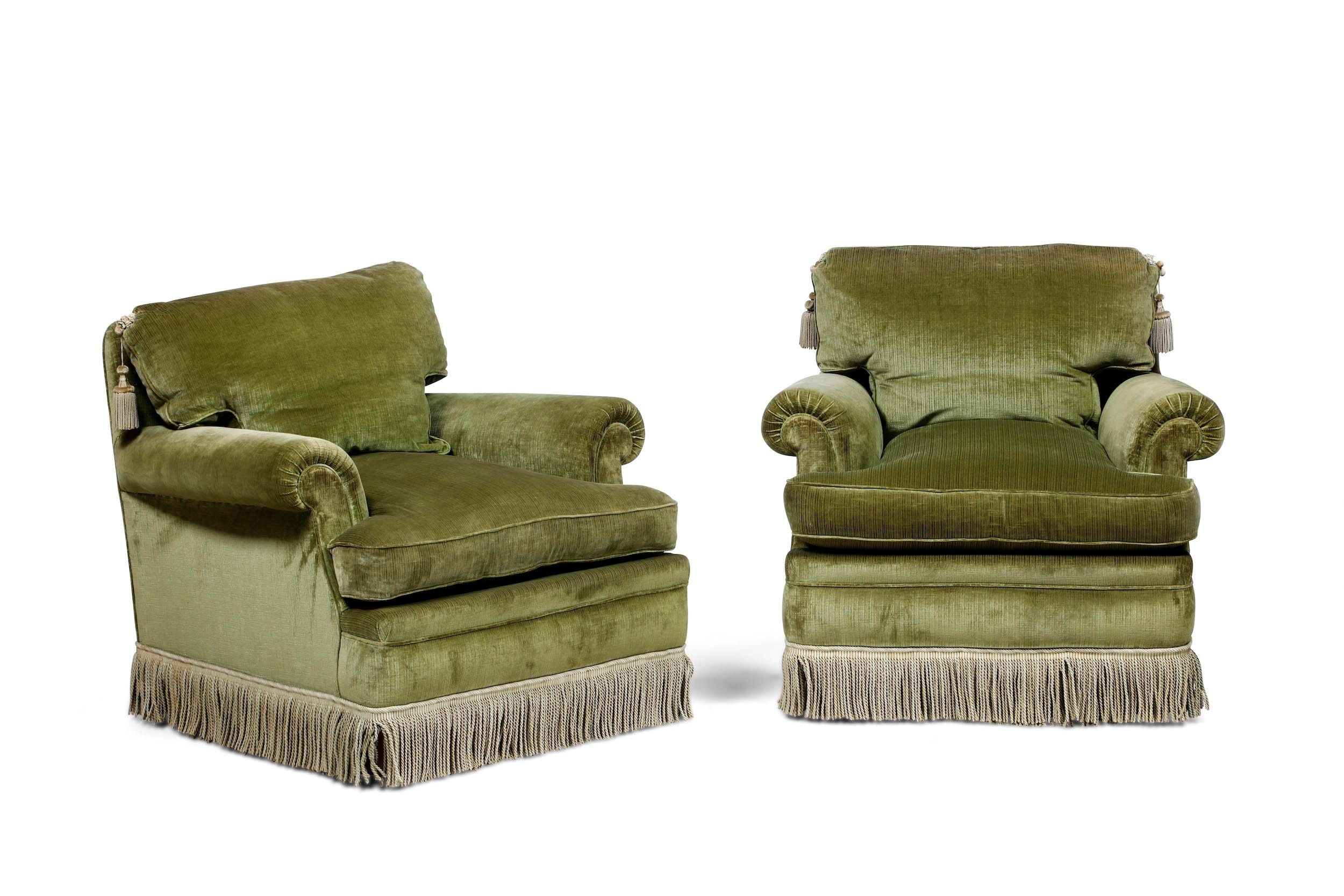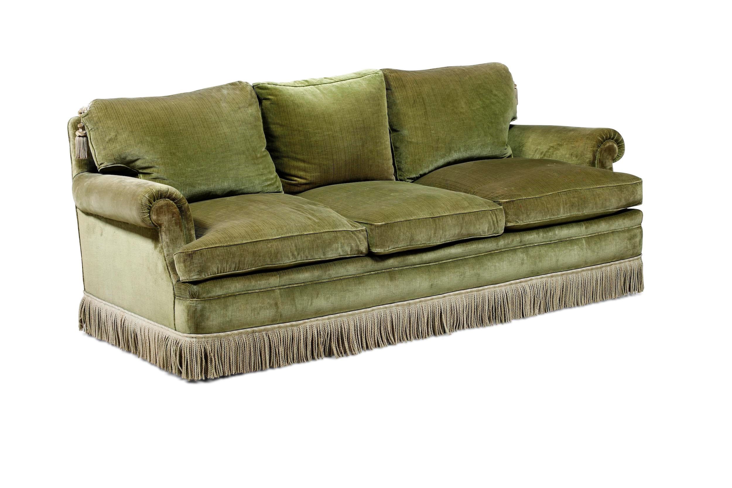 Divano e due poltrone imbottiti e rivestiti in tessuto verde