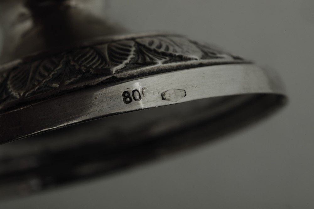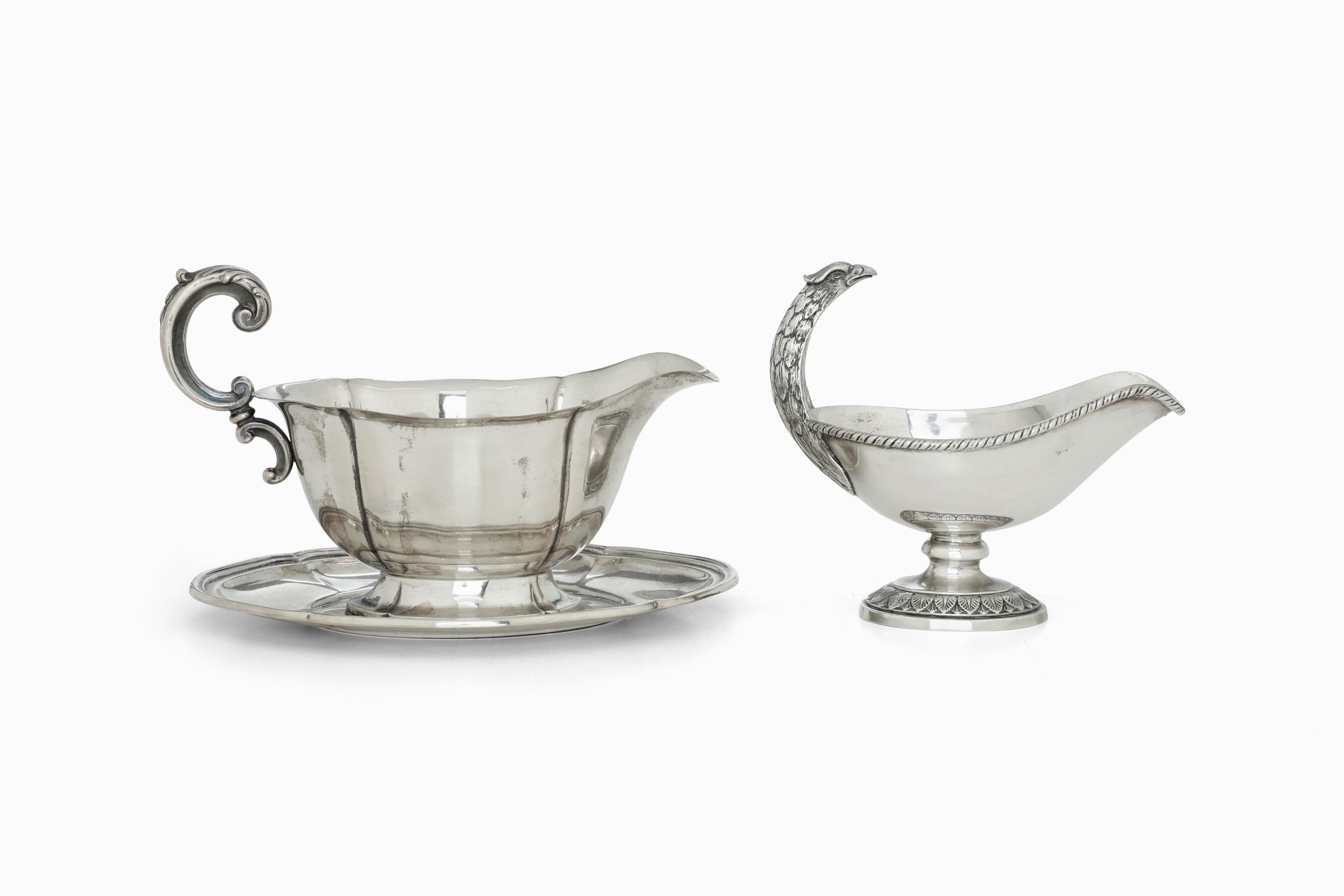 Due salsiere in argento. Argenteria italiana del XX secolo. Una con manico a volute [..]