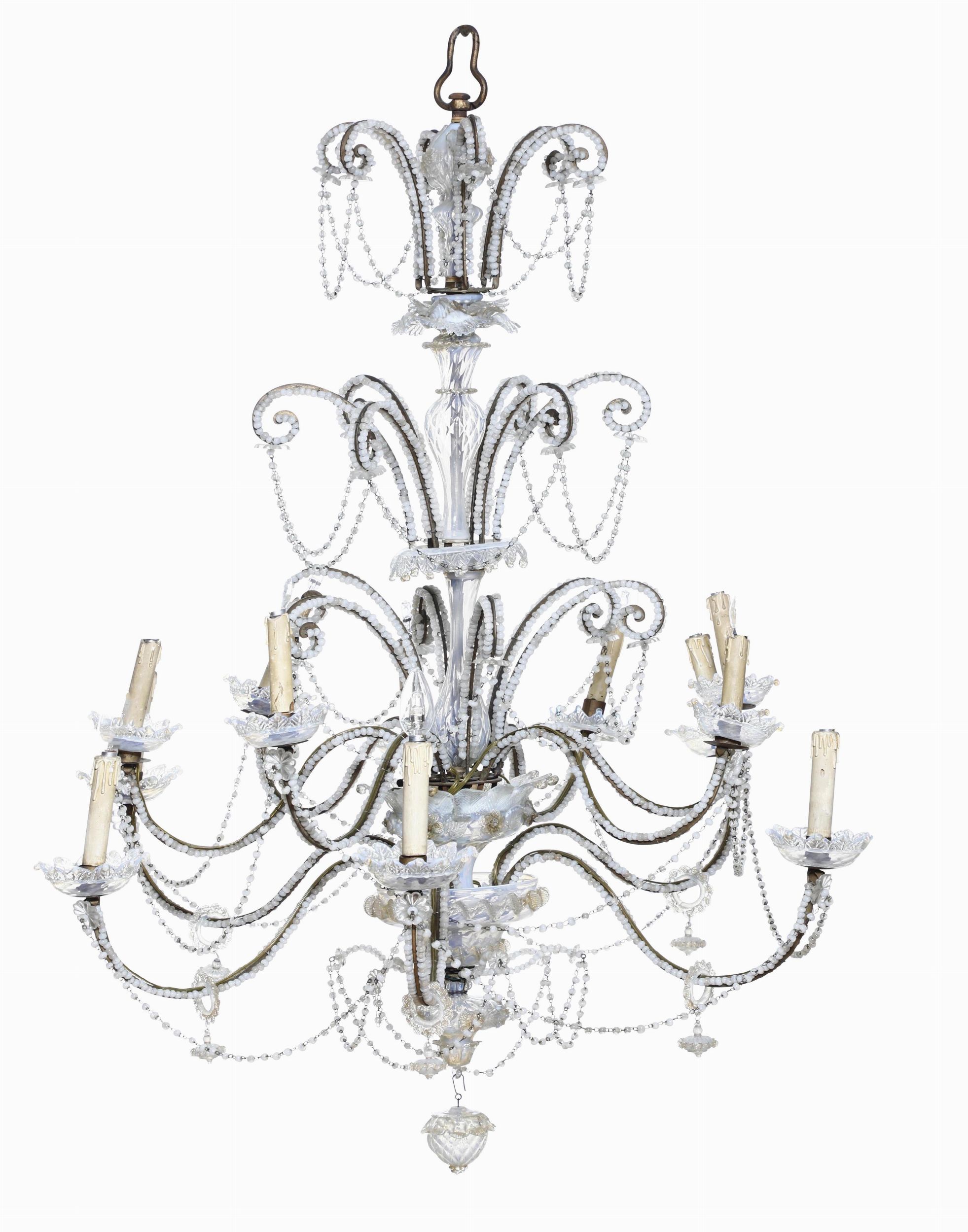 Lampadario a dodici luci in metallo e cristalli. XX secolo