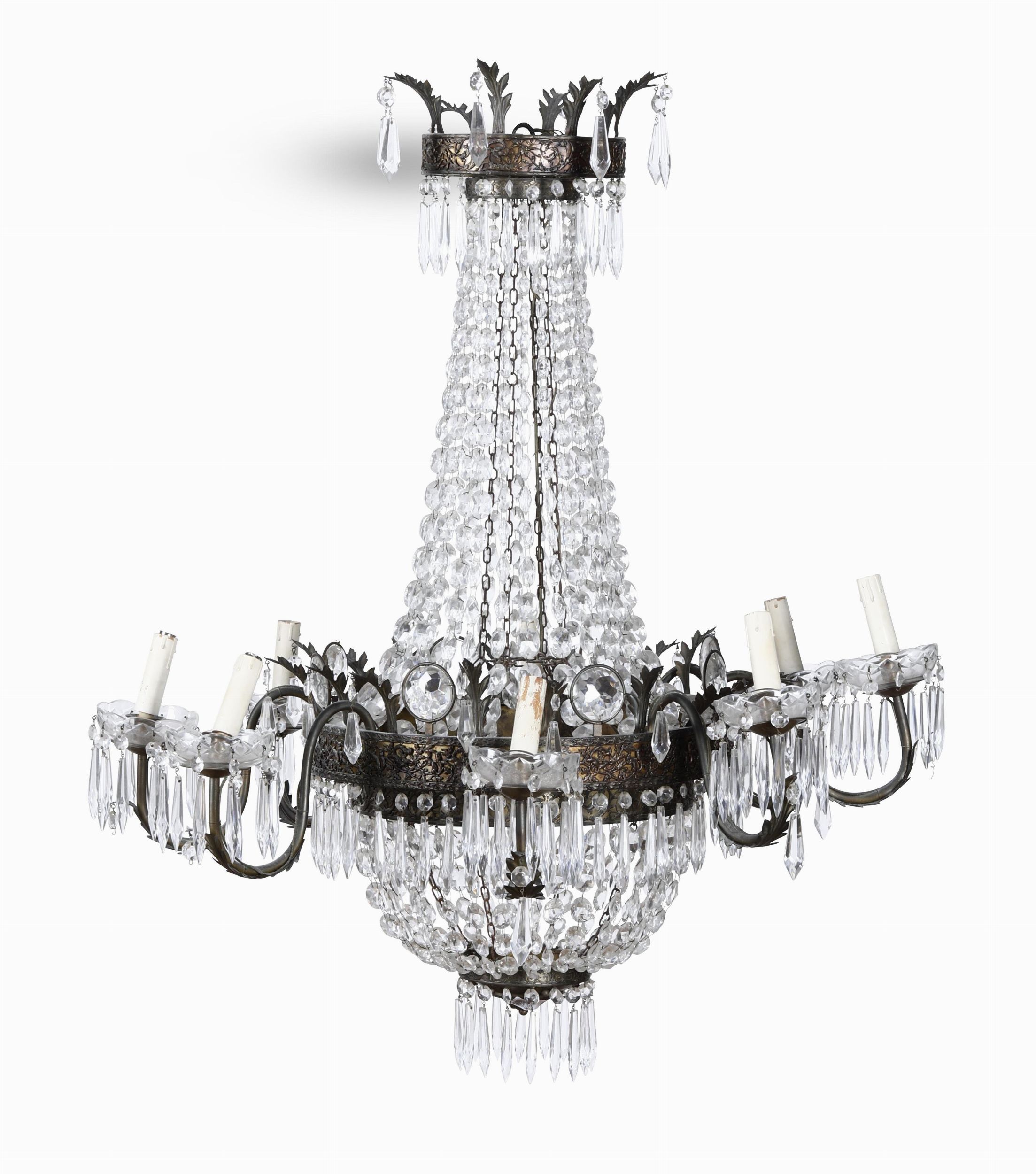 Lampadario a mongolfiera a otto luci in bronzo e cristalli. XIX secolo