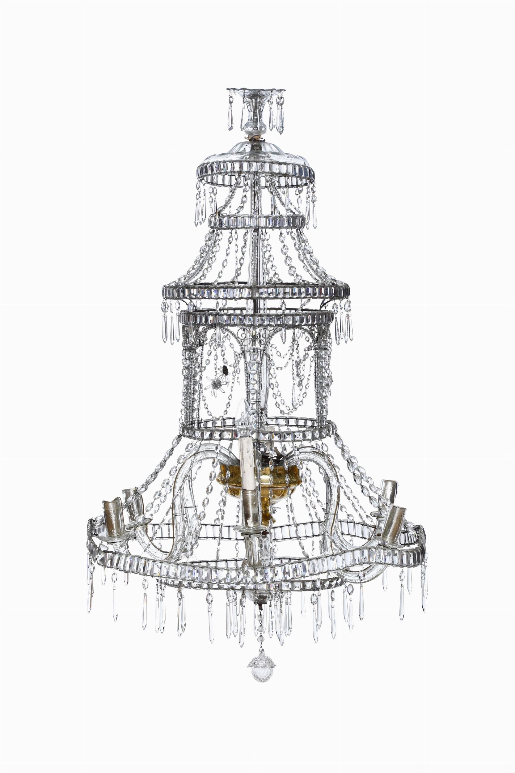 Lampadario a mongolfiera in metallo e cristalli. XIX-XX secolo