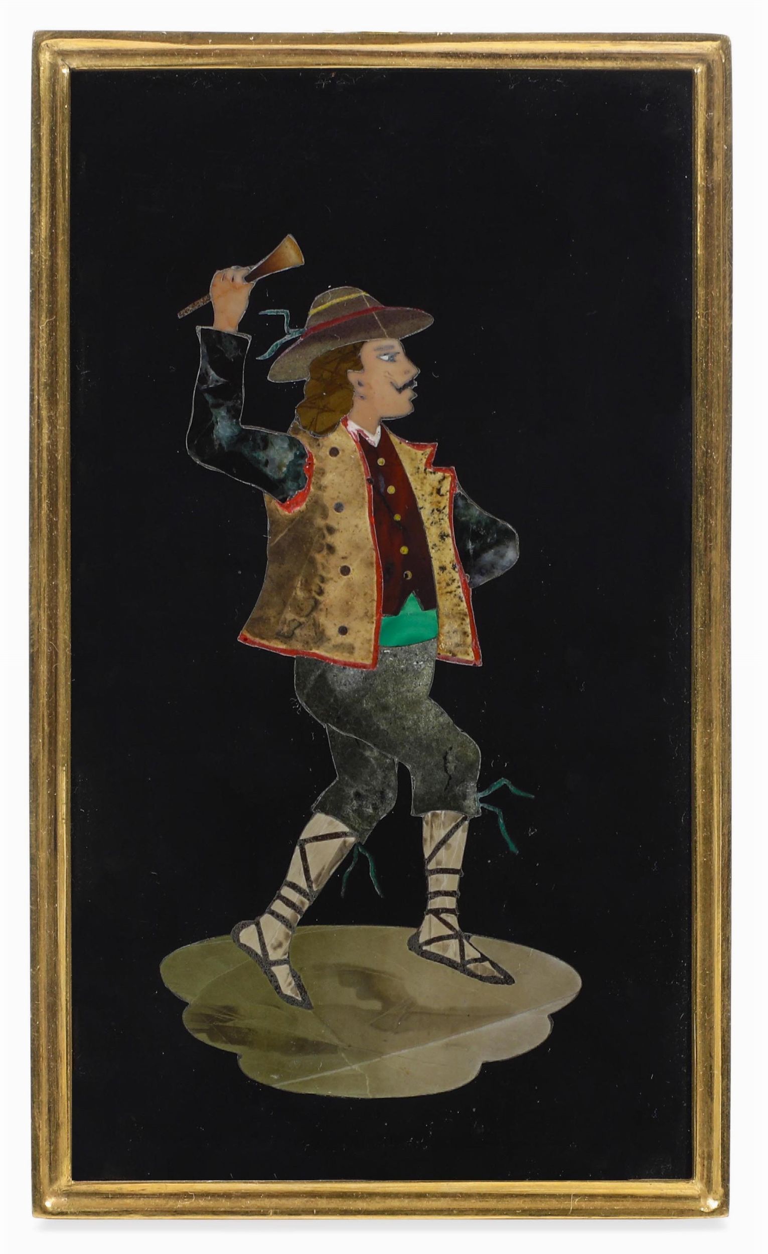 Mattonella in commesso di pietre dure e tenere su fondo in marmo nero del Belgio. [..]