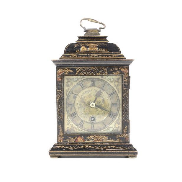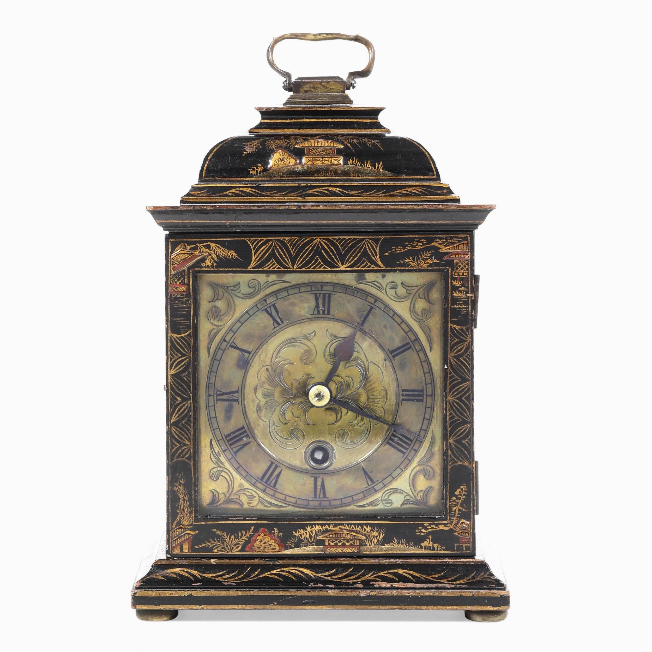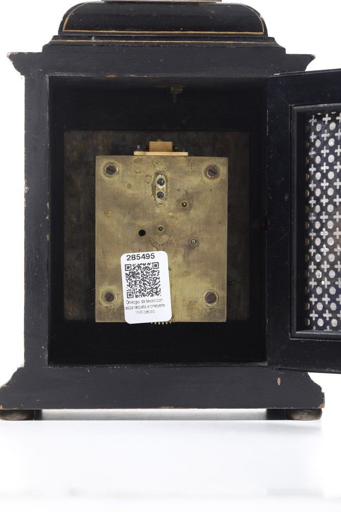 Pendola da tavolo con cassa in legno ebanizzato e laccato a cineserie. XVIII sec [..]