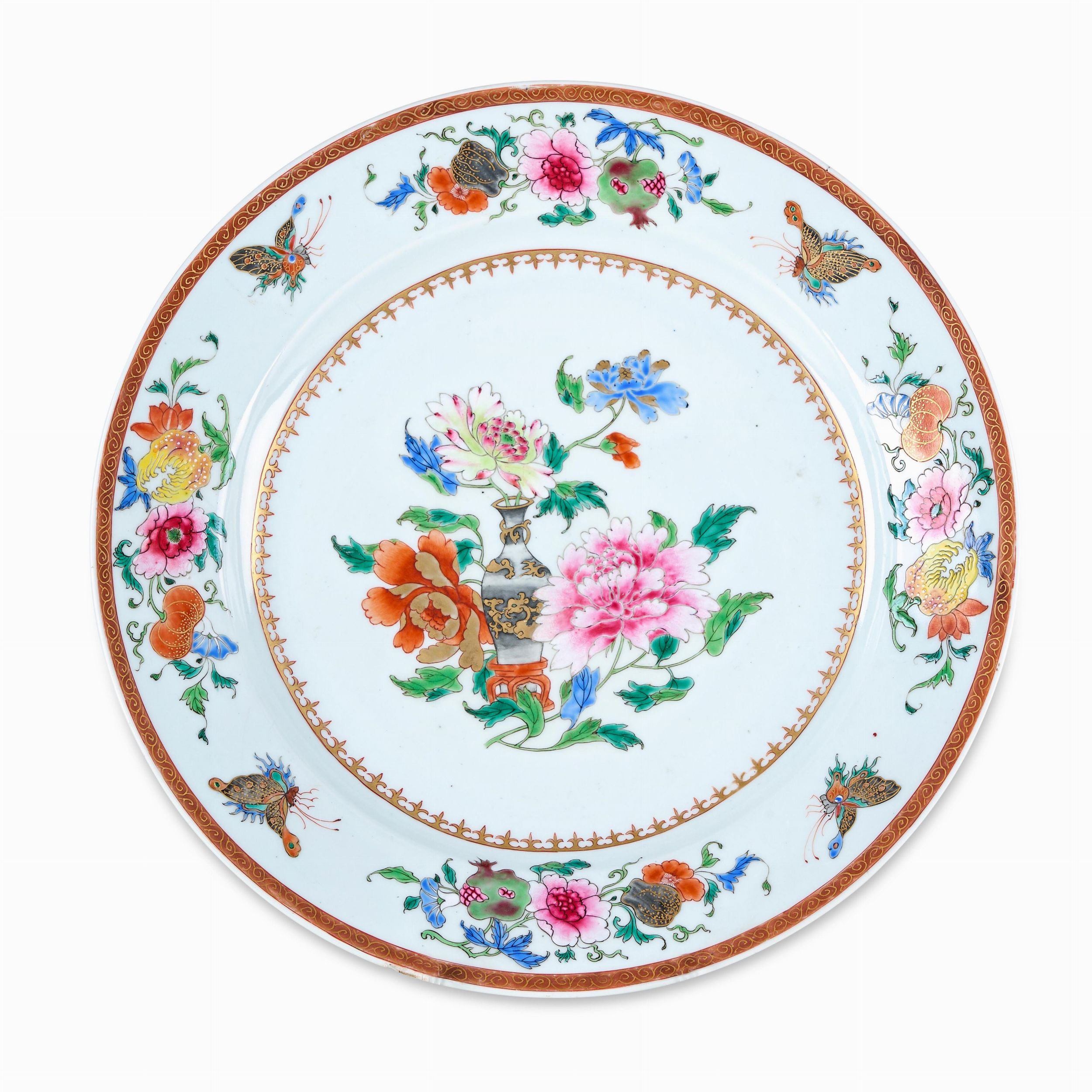 Piatto in porcellana Famiglia Rosa con decori floreali e soggetto naturalistico, [..]