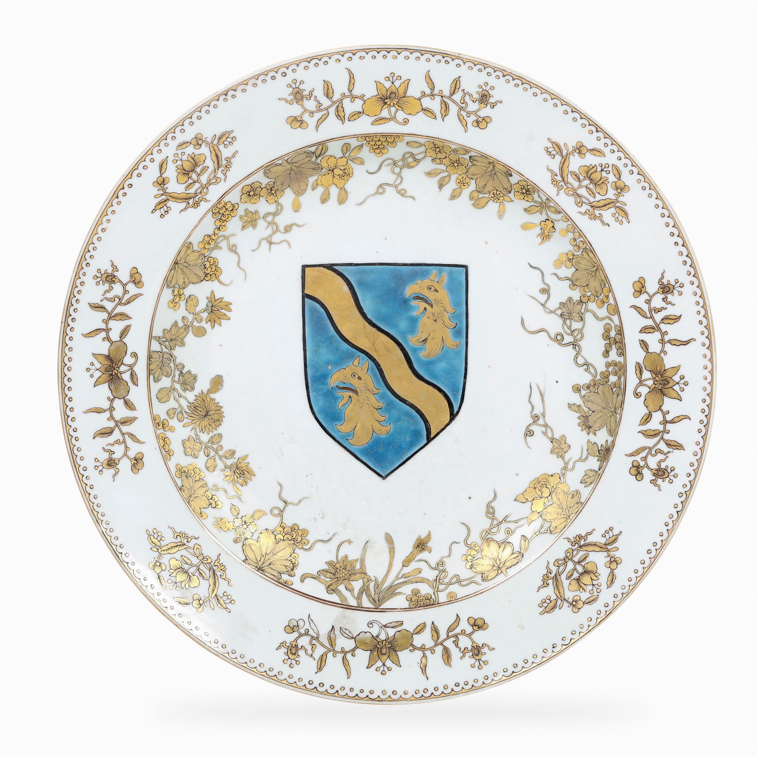 Piatto in porcellana stemmato con lumeggiatura in oro e stemma nobiliare policromo [..]