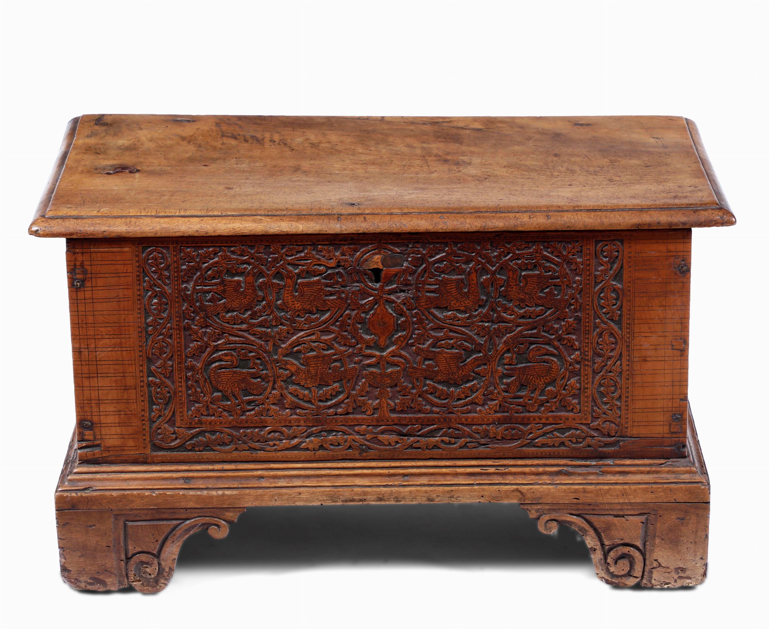 Piccola cassapanca in noce intagliato. XVII-XVIII secolo
