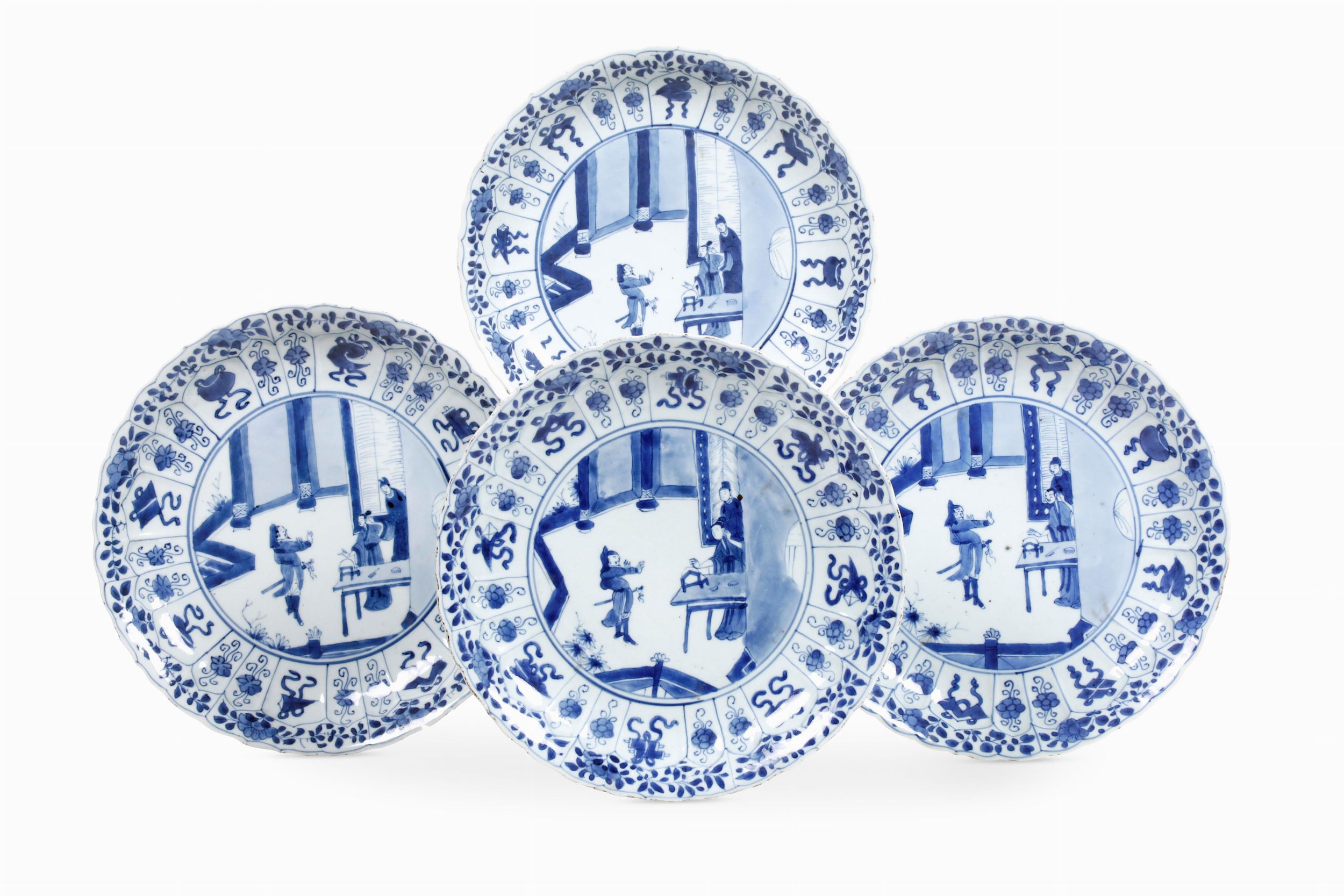 Quattro piatti in porcellana bianca e blu con personaggi e decori floreali, Cina, [..]