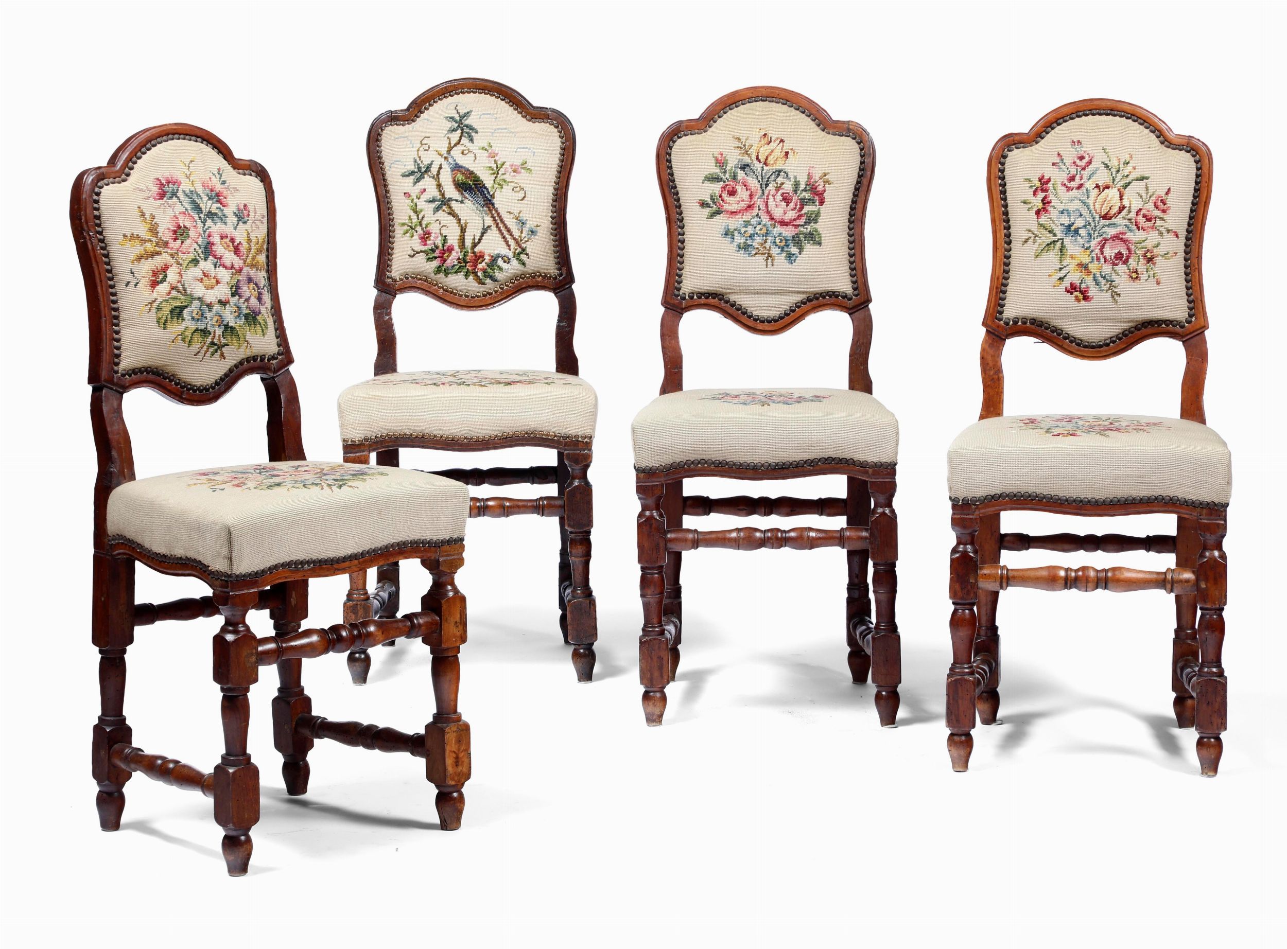 Quattro sedie in legno con montanti a rocchetto. XIX-XX secolo