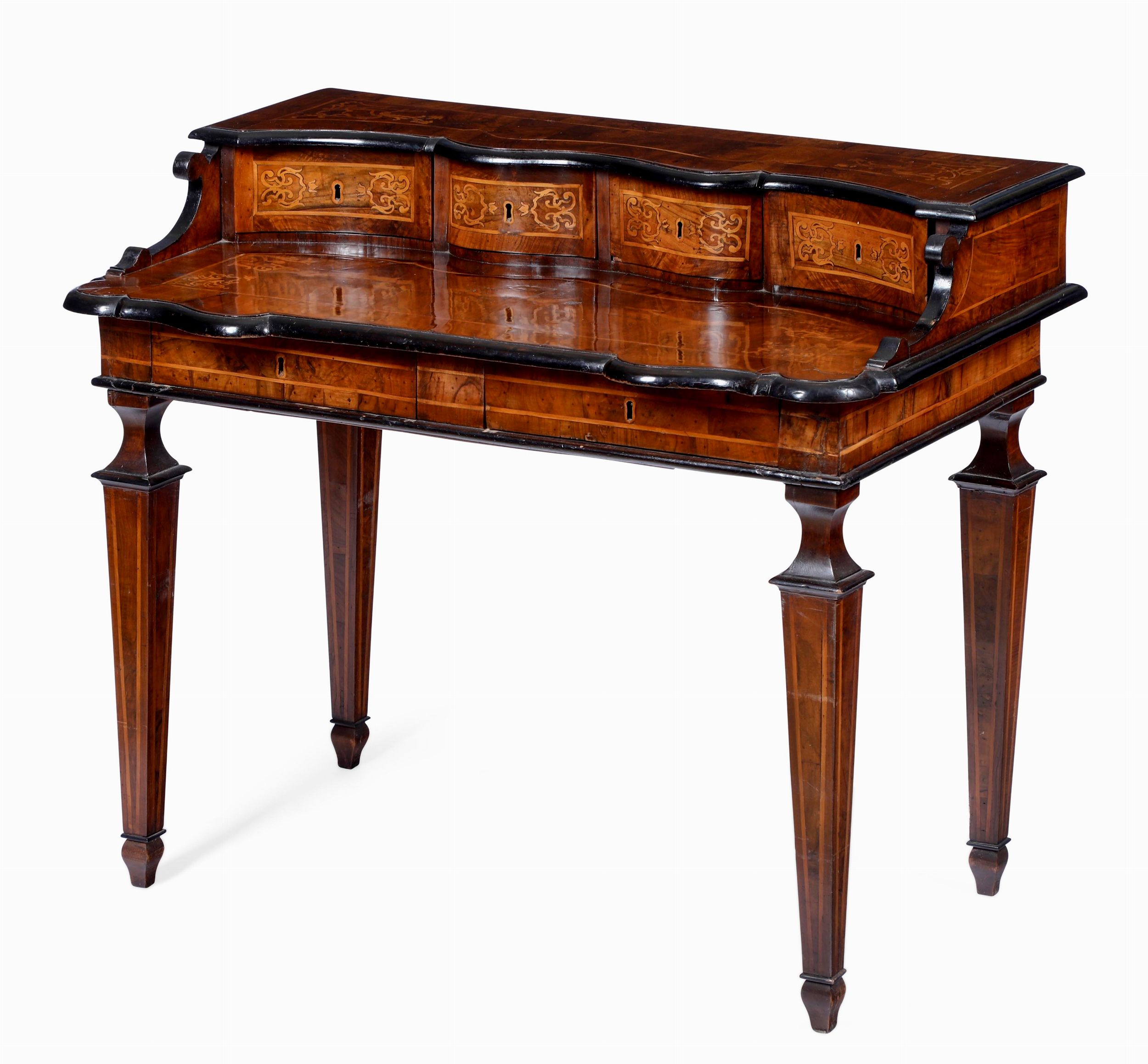 Scrittoio in legno lastronato, filettato ed intarsiato. Stato Pontificio XVIII s [..]