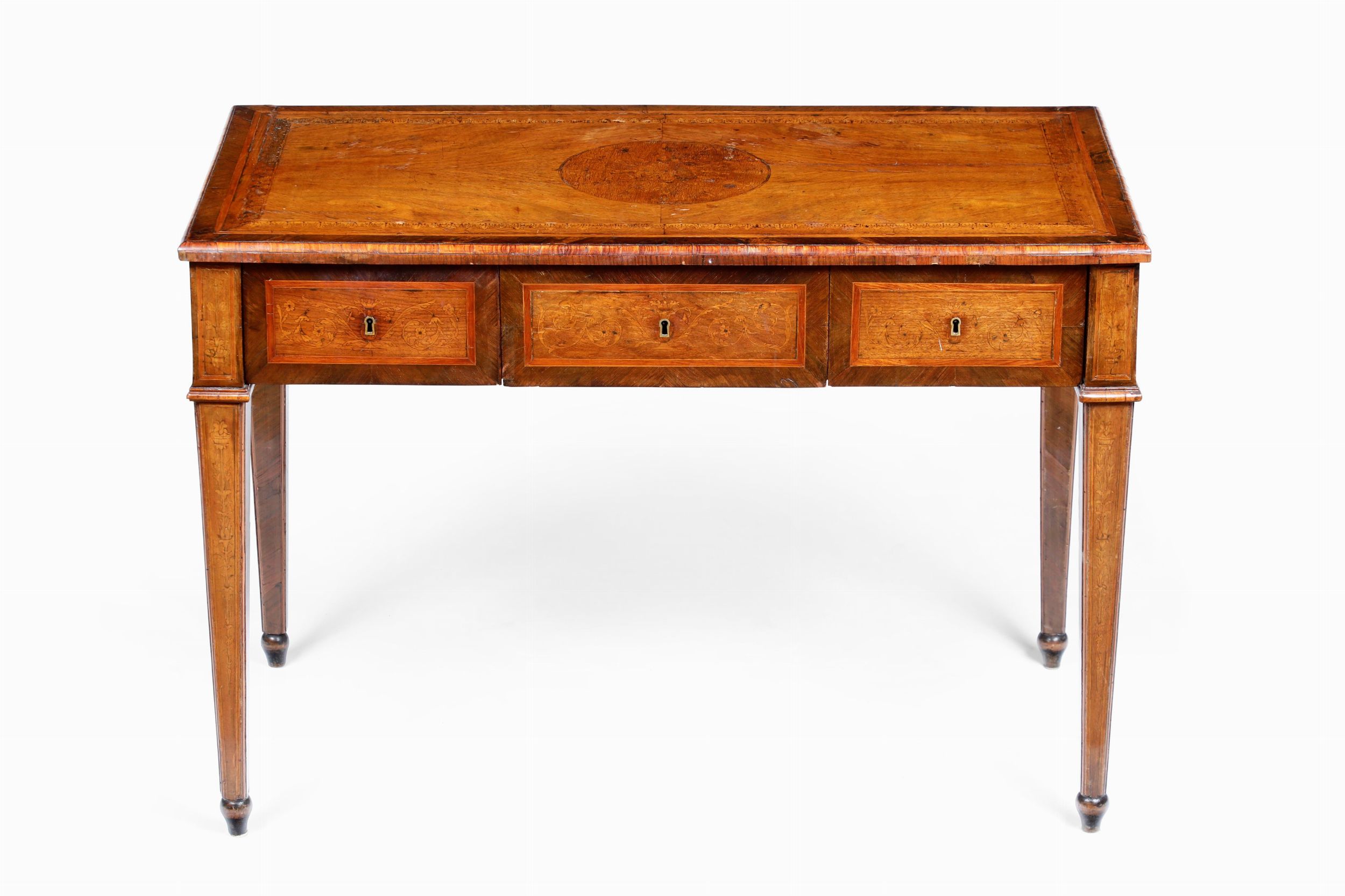 Tavolo lastronato in noce ed intarsiato in varie essenze. XIX secolo