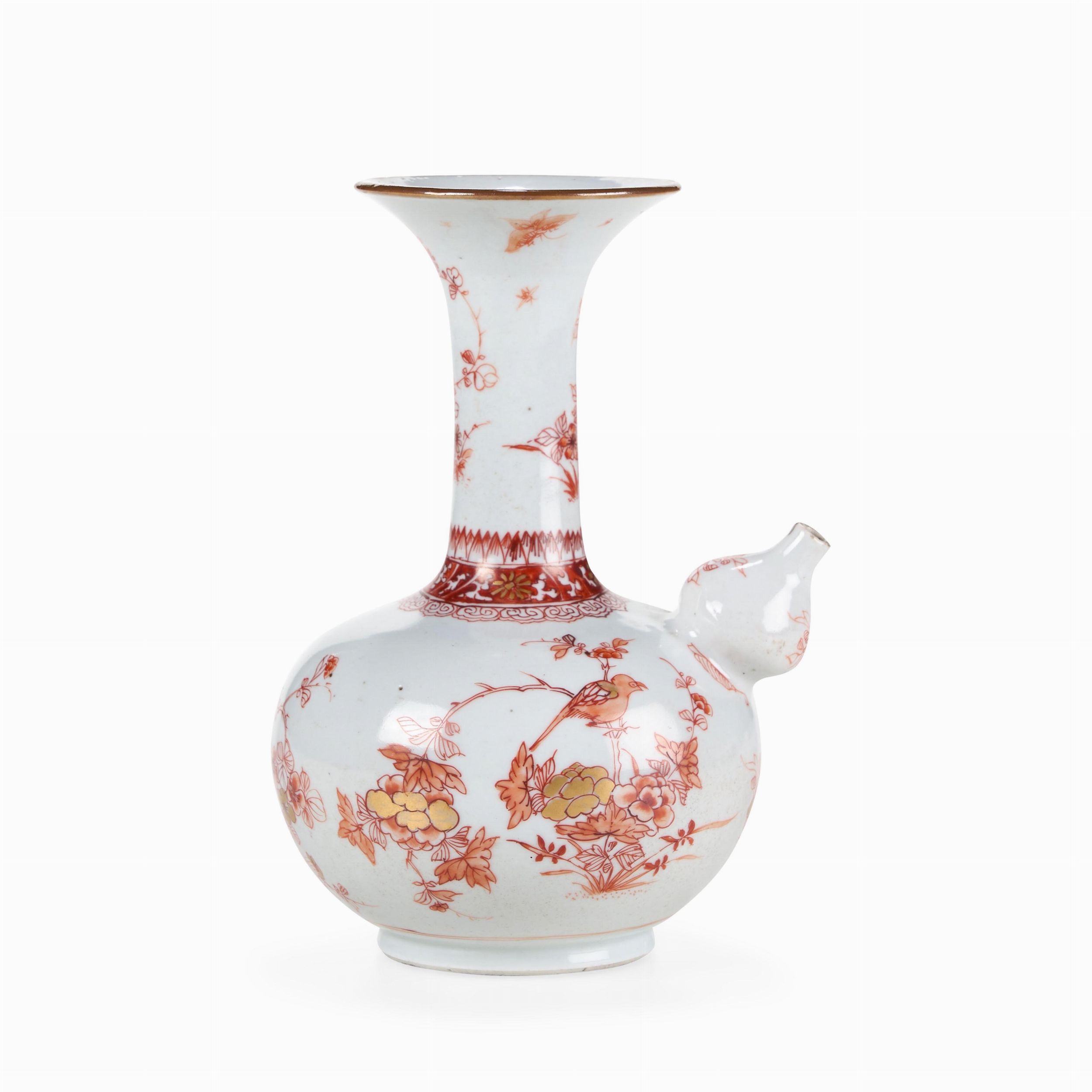 Versatoio in porcellana con decoro di uccellini tra i rami sui toni dell’arancio, [..]