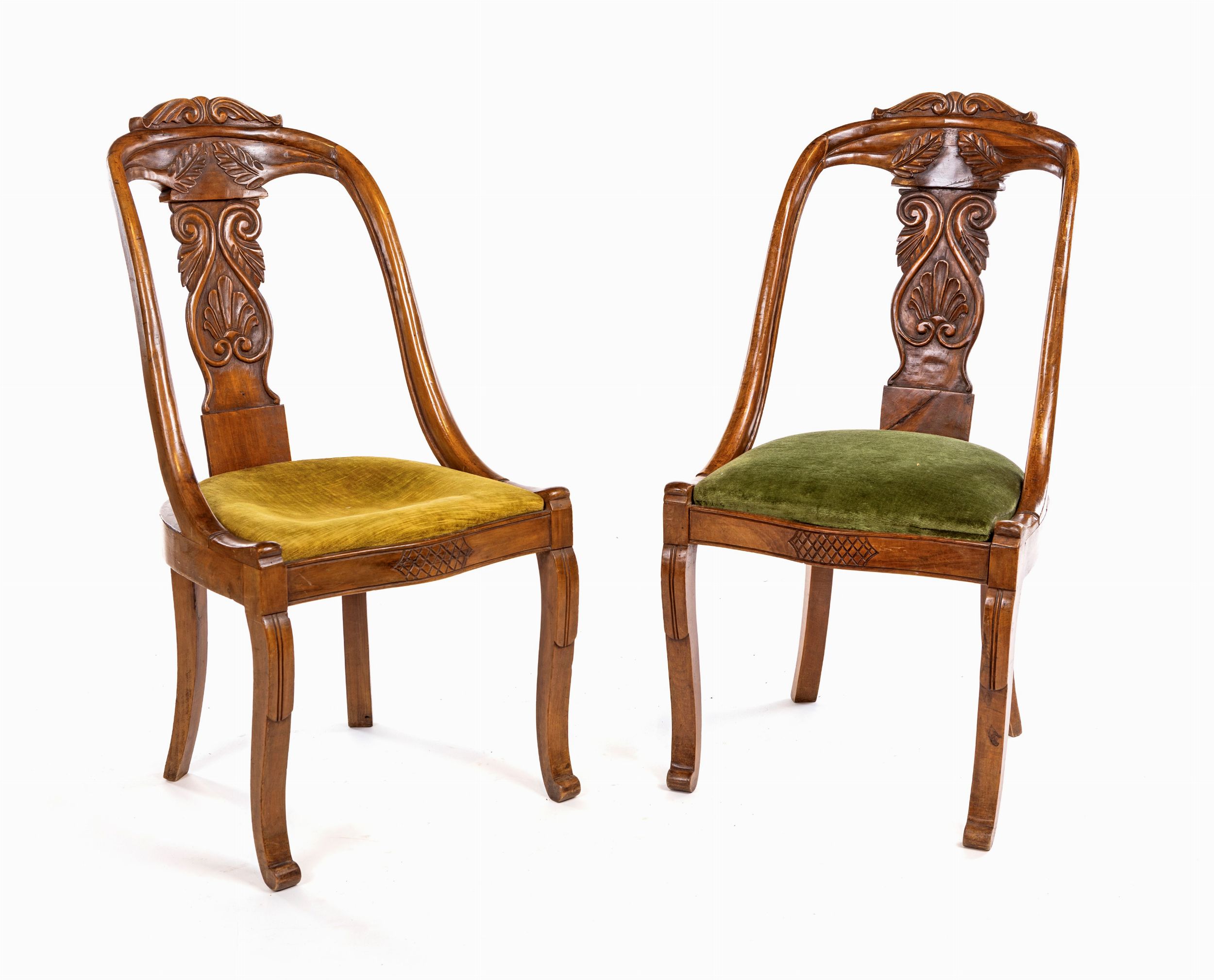 con schienale a giorno decorato da rilievi vegetali intagliati, sedile imbottito, gambe anteriori sagomate, posteriori a sciabola