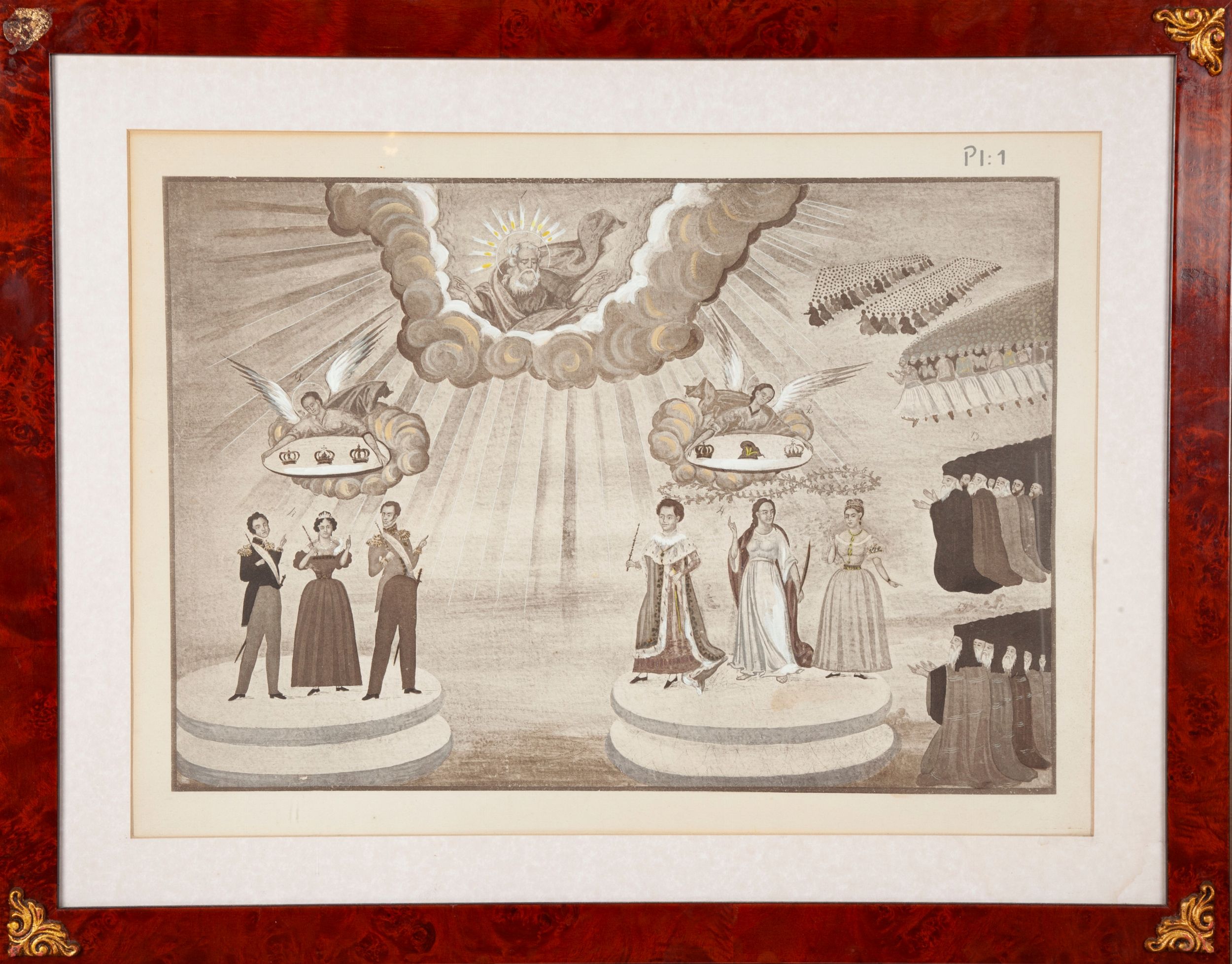 due acquerelli su carta applicata su cartoncino, cm 40x57 - in cornice cm 62x79 a) Il giudizio di Dio per la liberazione della Grecia b) Varie battaglie della Grecia orientale con Tebe al centro (n. 22)