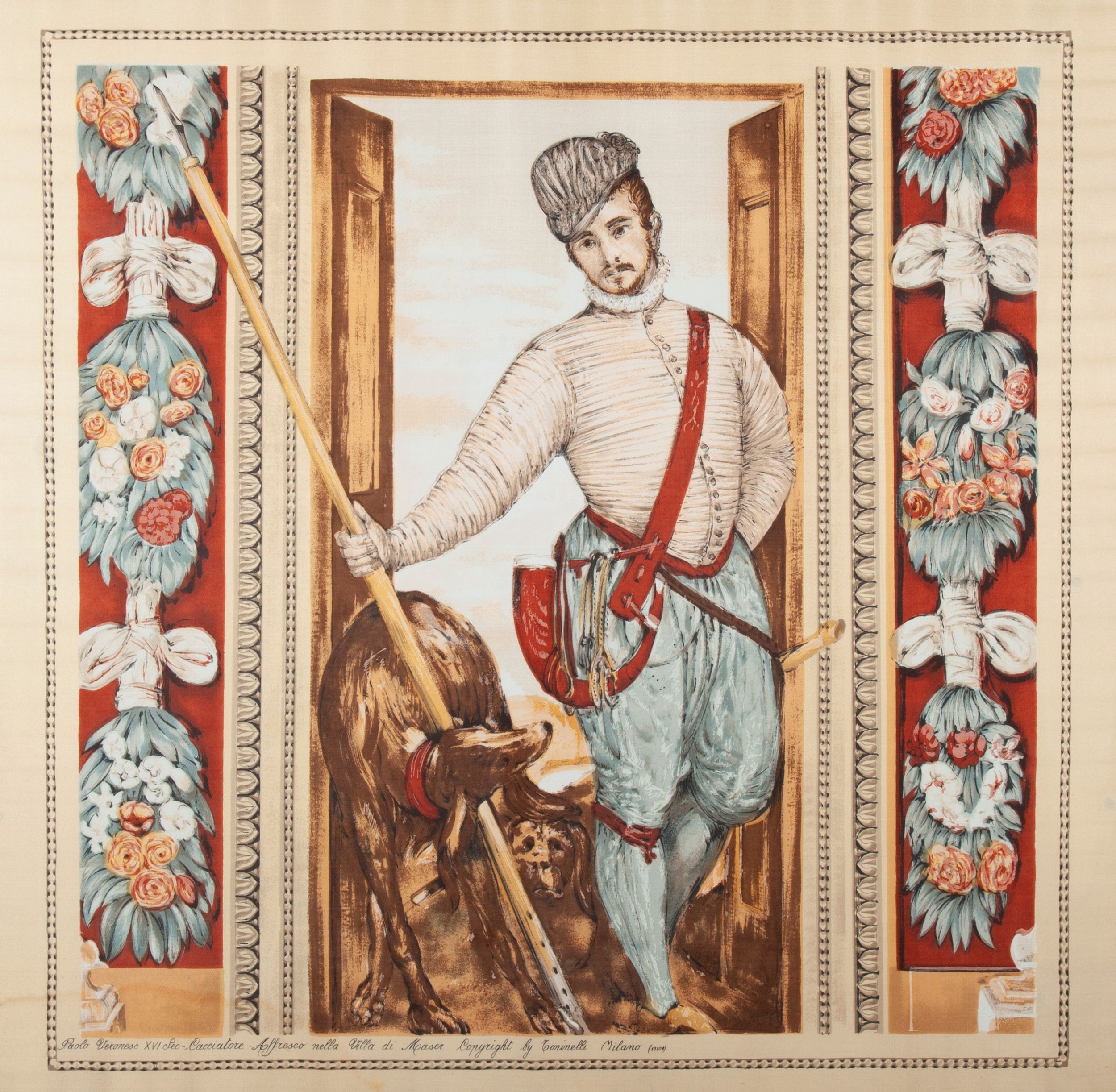cm 90x88 raffigurante il giovane cacciatore, da un affresco di Paolo Veronese nella Villa di Maser, come da iscrizione in basso seguita da copyright by Toninelli - Milano (13108); entro cornice
